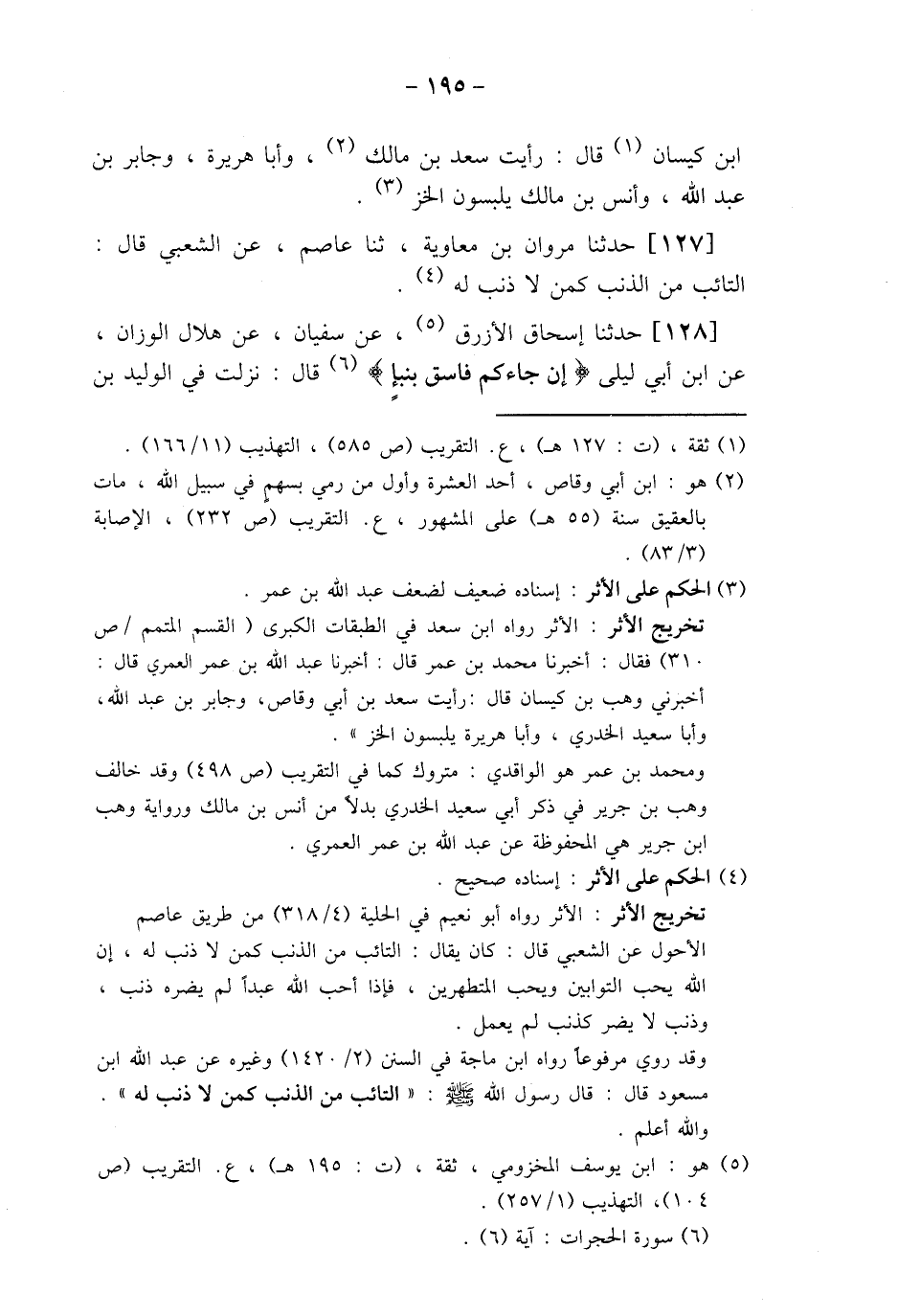 127 - حَدَّثَنَا مَرْوَانُ بْنُ مُعَاوِيَةَ، ثنا عَاصِمٌ، عَنِ الشَّعْبِيِّ قَالَ: «§التَّائِبُ مِنَ الذَّنْبِ كَمَنْ لَا ذَنْبَ لَهُ»