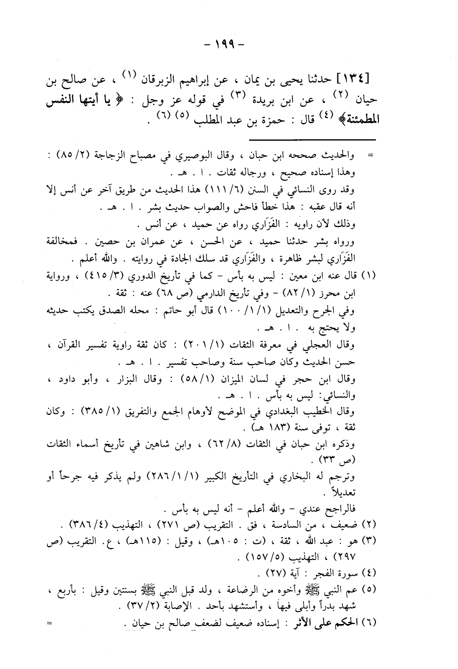134 - حَدَّثَنَا يَحْيَى بْنُ يَمَانٍ، عَنْ إِبْرَاهِيمَ بْنِ الزِّبْرِقَانِ، عَنْ صَالِحِ بْنِ حَيَّانَ، عَنِ ابْنِ بُرَيْدَةَ فِي قَوْلِهِ عَزَّ وَجَلَّ: {§يَا أَيَّتُهَا النَّفْسُ الْمُطْمَئِنَّةُ} [الفجر: 27] قَالَ: «حَمْزَةُ بْنُ عَبْدِ الْمُطَّلِبِ»