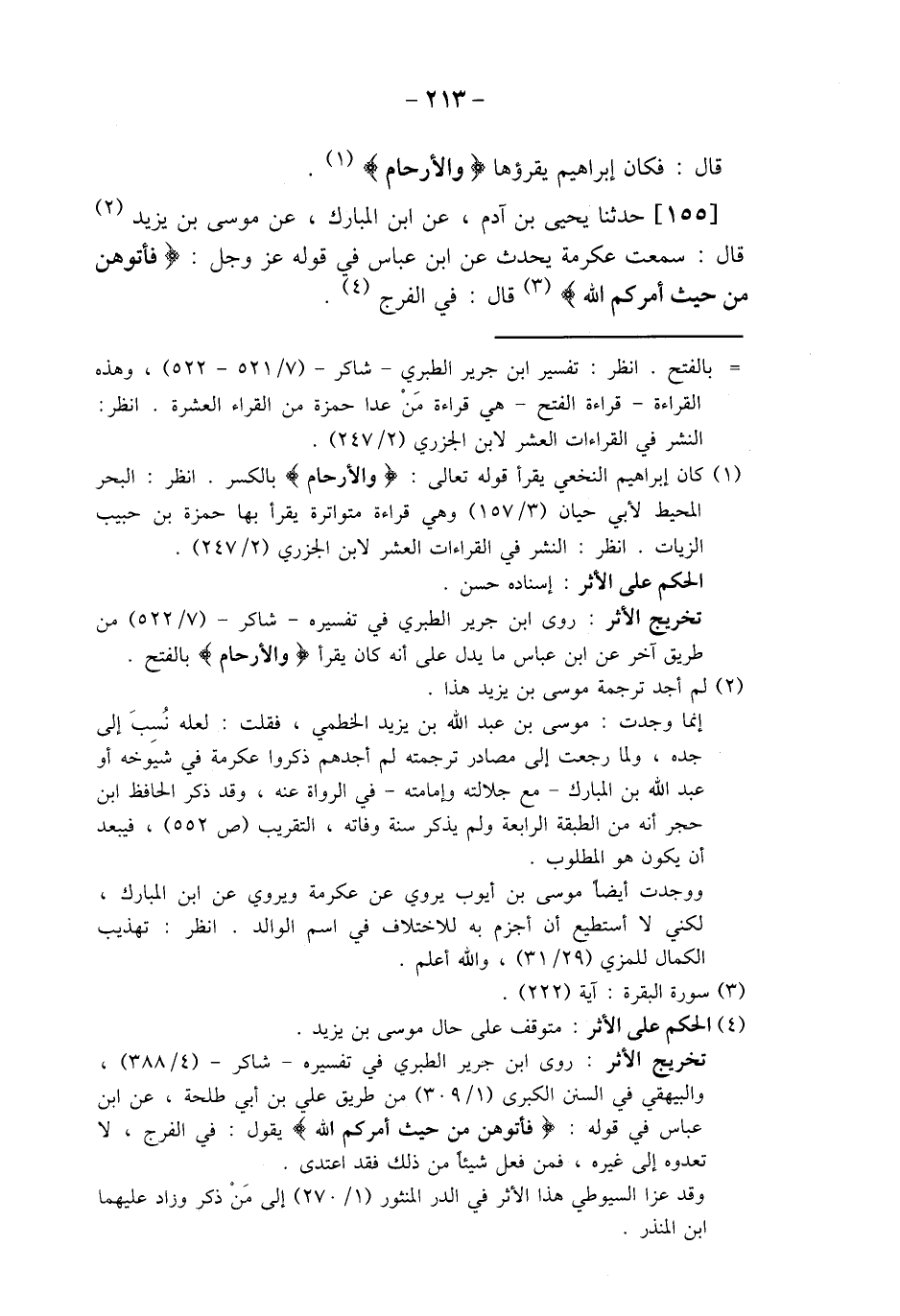155 - حَدَّثَنَا يَحْيَى بْنُ آدَمَ، عَنِ ابْنِ الْمُبَارَكِ، عَنْ مُوسَى بْنِ يَزِيدَ، قَالَ: سَمِعْتُ عِكْرِمَةَ يُحَدِّثُ، عَنِ ابْنِ عَبَّاسٍ فِي قَوْلِهِ عَزَّ وَجَلَّ: {§فَأْتُوهُنَّ مِنْ حَيْثُ أَمَرَكُمُ اللَّهُ} [البقرة: 222] قَالَ: «فِي الْفَرْجِ»