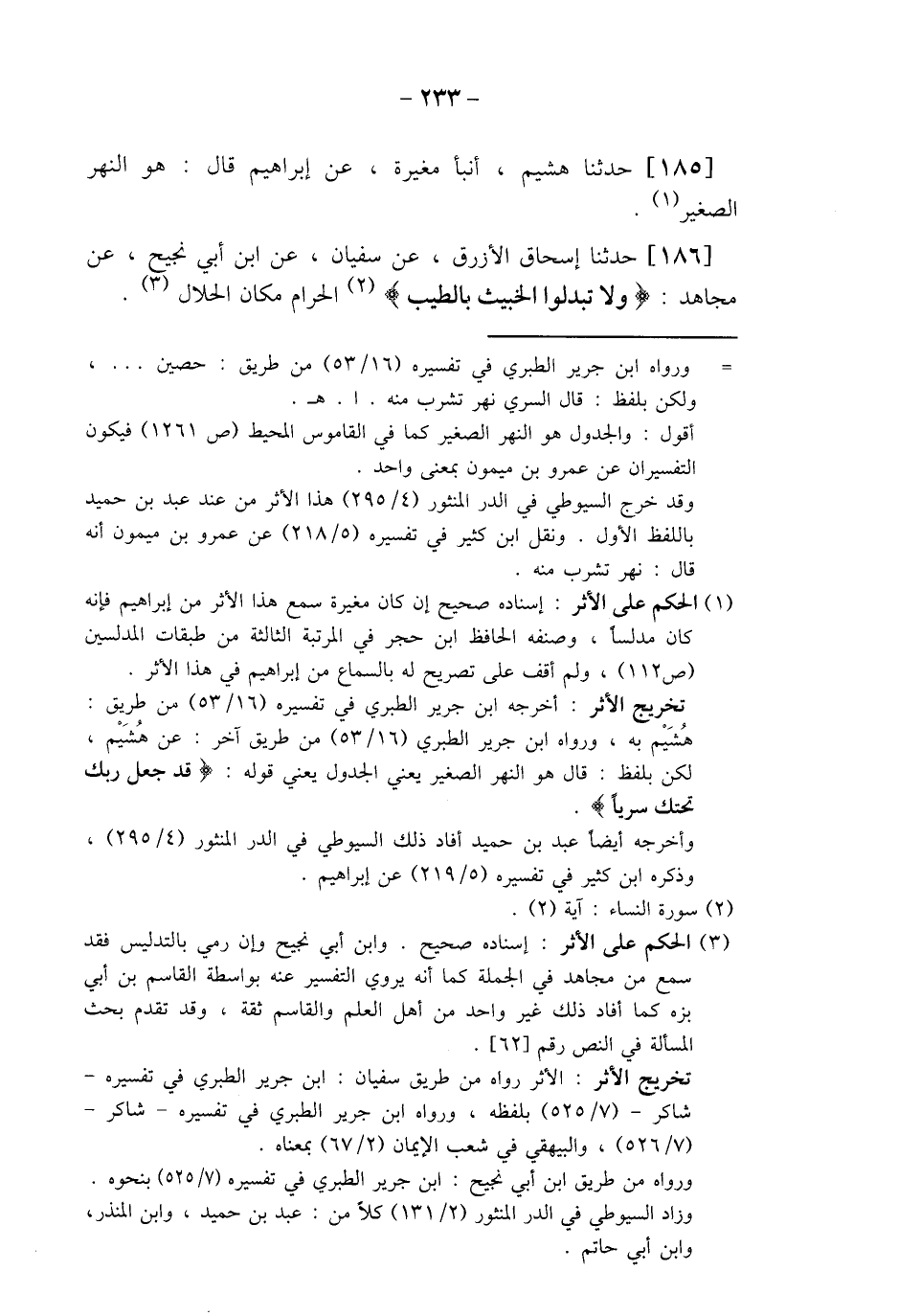 186 - حَدَّثَنَا إِسْحَاقُ الْأَزْرَقُ، عَنْ سُفْيَانَ، عَنِ ابْنِ أَبِي نَجِيحٍ، عَنْ مُجَاهِدٍ، {§وَلَا تَتَبَدَّلُوا الْخَبِيثَ بِالطَّيِّبِ} [النساء: 2] ، «الْحَرَامَ مَكَانَ الْحَلَالِ»