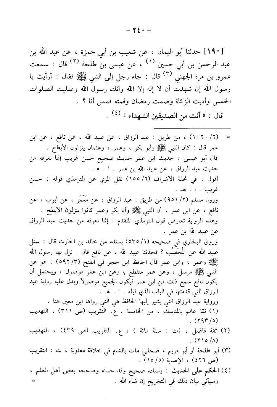190 - حَدَّثَنَا أَبُو الْيَمَانِ، عَنْ شُعَيْبِ بْنِ أَبِي حَمْزَةَ، عَنْ عَبْدِ اللَّهِ بْنِ عَبْدِ الرَّحْمَنِ بْنِ أَبِي حُسَيْنٍ، عَنْ عِيسَى بْنِ طَلْحَةَ قَالَ: سَمِعْتُ عَمْرَو بْنَ مُرَّةَ الْجُهَنِيَّ، قَالَ: جَاءَ رَجُلٌ إِلَى النَّبِيِّ صَلَّى اللهُ عَلَيْهِ وَسَلَّمَ فَقَالَ: أَرَأَيْتَ يَا رَسُولَ اللَّهِ، إِنْ شَهِدْتُ أَنَّ لَا إِلَهَ إِلَّا اللَّهُ، وَأَنَّكَ رَسُولُ اللَّهِ، وَصَلَّيْتُ الصَّلَوَاتِ الْخَمْسِ، وَأَدَّيْتُ الزَّكَاةَ، وَصُمْتُ رَمَضَانَ، وَقُمْتُهُ، فَمِمَّنْ أَنَا؟ قَالَ: «§أَنْتَ مِنَ الصِّدِّيقِينَ الشُّهَدَاءِ»