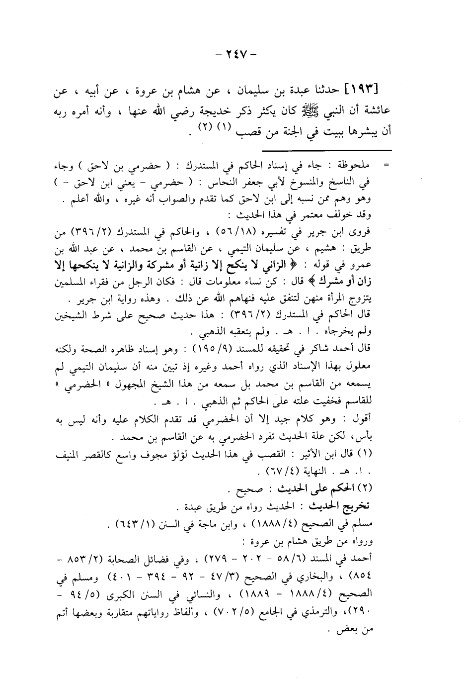 193 - حَدَّثَنَا عَبْدَةُ بْنُ سُلَيْمَانَ، عَنْ هِشَامِ بْنِ عُرْوَةَ، عَنْ أَبِيهِ، عَنْ عَائِشَةَ، أَنَّ النَّبِيَّ صَلَّى اللهُ عَلَيْهِ وَسَلَّمَ، كَانَ «§يُكْثِرُ ذِكْرَ خَدِيجَةَ رَضِيَ اللَّهُ عَنْهَا، وَأَنَّهُ أَمَرَهُ رَبُّهُ أَنْ يُبَشِّرَهَا بِبَيْتٍ فِي الْجَنَّةِ مِنْ قَصَبٍ»