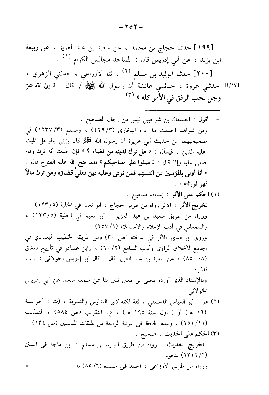 200 - حَدَّثَنَا الْوَلِيدُ بْنُ مُسْلِمٍ، ثنا الْأَوْزَاعِيُّ، حَدَّثَنِي الزُّهْرِيُّ، حَدَّثَنِي عُرْوَةُ، حَدَّثَتْنِي عَائِشَةُ، أَنَّ رَسُولَ اللَّهِ صَلَّى اللهُ عَلَيْهِ وَسَلَّمَ قَالَ: «إِنَّ §اللَّهَ عَزَّ وَجَلَّ يُحِبُّ الرِّفْقَ فِي الْأَمْرِ كُلِّهِ»