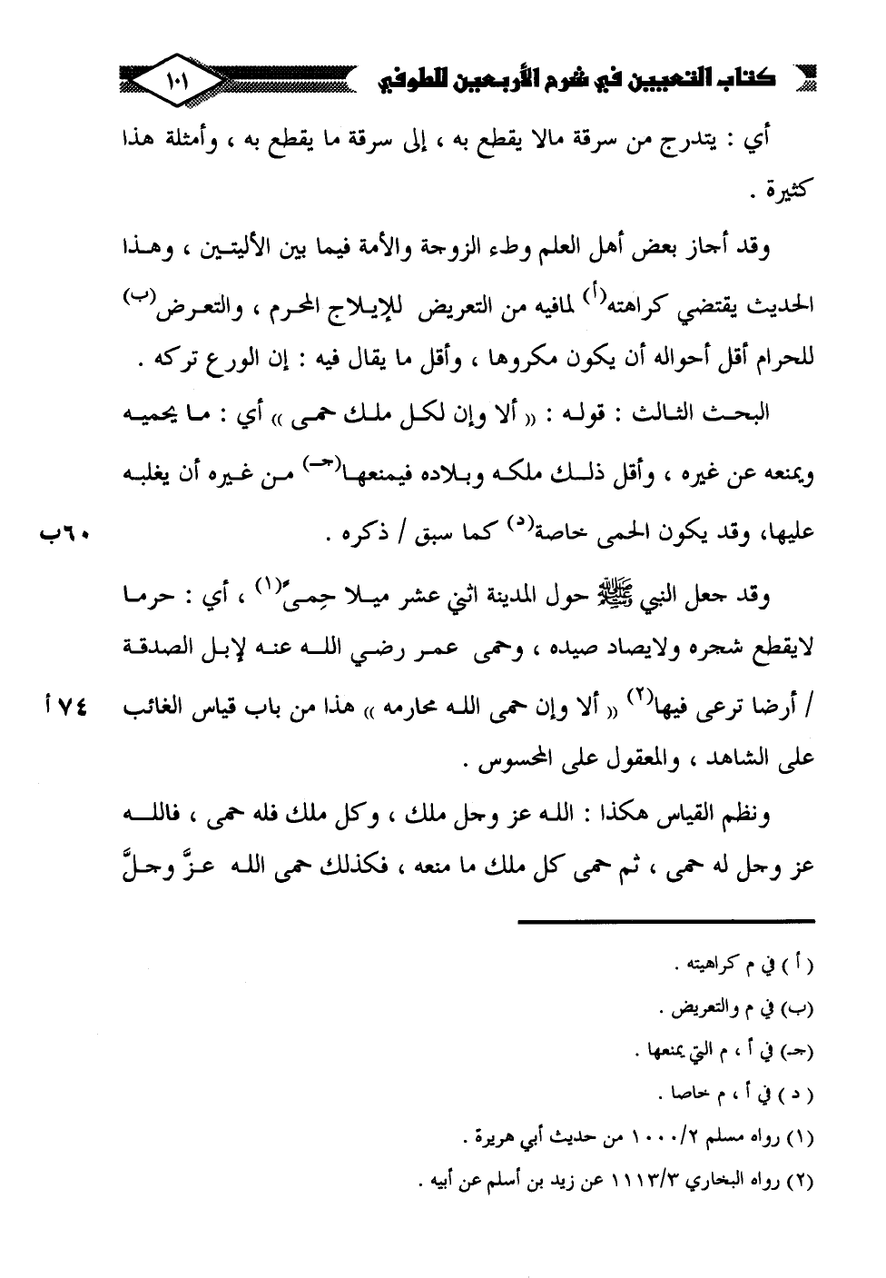 البحث الثالث: قوله: "ألا وإن لكل ملك حمى" أي: ما يحميه ويمنعه عن غيره، وأقل ذلك ملكه وبلاده فيمنعها (جـ) من غيره أن يغلبه عليها، وقد يكون الحمى خاصة (د) كما سبق ذكره.