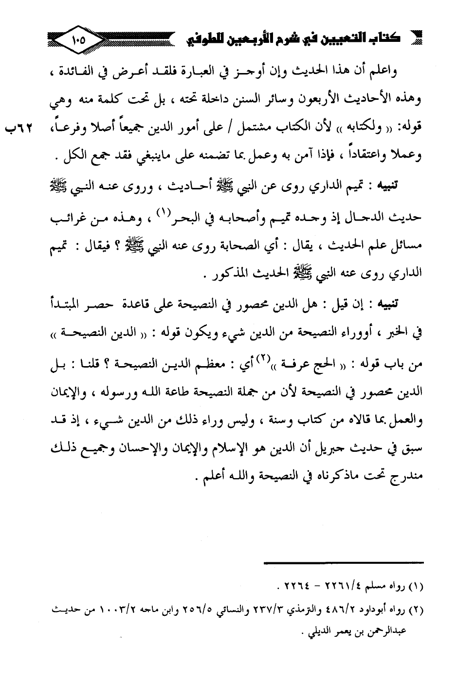 تنبيه: إن قيل: هل الدين محصور في النصيحة على قاعدة حصر المبتدأ في الخبر، أو وراء النصيحة من الدين شيء ويكون قوله: "الدين النصيحة" من باب قوله: "الحج عرفة" (¬2) أي: معظم الدين النصيحة؟ قلنا: بل الدين محصور في النصيحة لأن من جملة النصيحة طاعة الله ورسوله، والإيمان والعمل بما قالاه من كتاب وسنة، وليس وراء ذلك من الدين شيء، إذ قد سبق في حديث حبريل أن الدين هو الإسلام والإيمان والإحسان وجميع ذلك مندرج تحت ما ذكرناه في النصيحة والله أعلم.