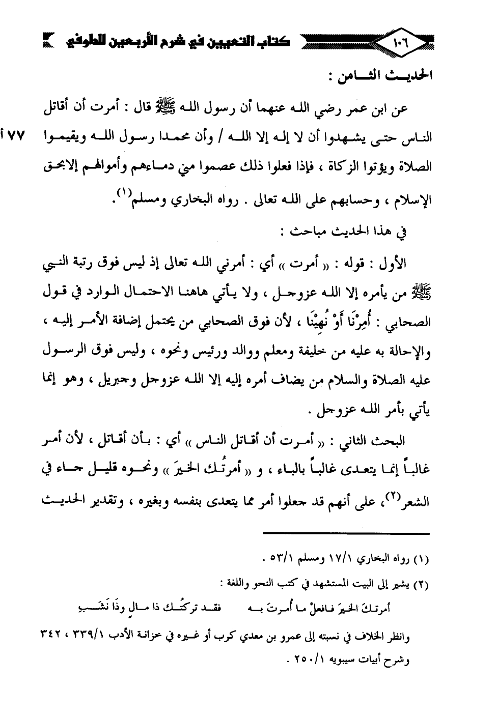 البحث الثاني: "أمرت أن أقاتل الناس" أي: بأن أقاتل، لأن أمر غالبًا إنما يتعدى غالبًا بالباء، و "أمرتُك الخيرَ" ونحوه قليل جاء في الشعر (¬2)، على أنهم قد جعلوا أمر مما يتعدى بنفسه وبغيره، وتقدير الحديث