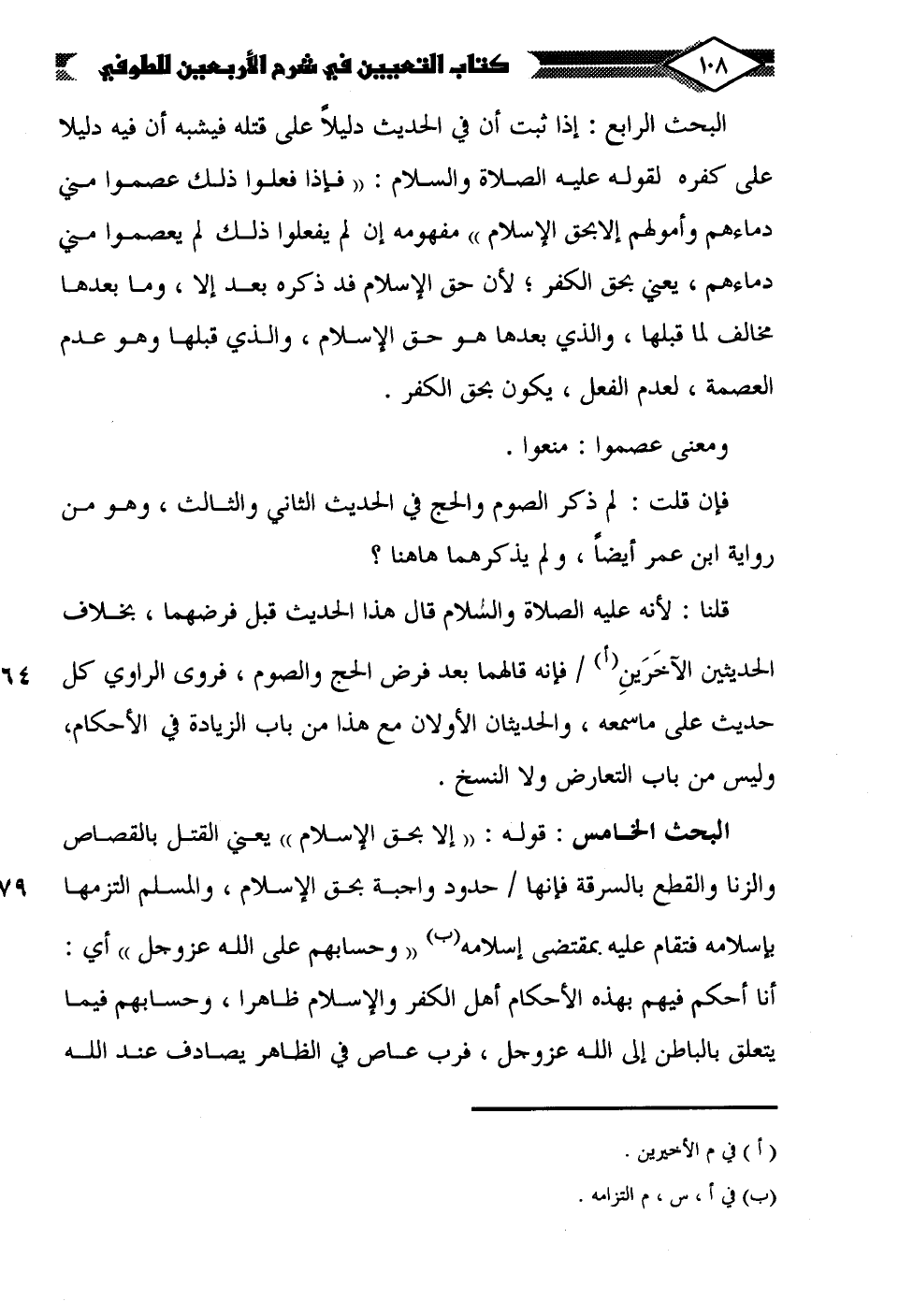 البحث الرابع: إذا ثبت أن في الحديث دليلًا على قتله فيشبه أن فيه دليلا على كفره لقوله عليه الصلاة والسلام: "فإذا فعلوا ذلك عصموا مني دماءهم وأمولهم إلا بحق الإسلام" مفهومه إن لم يفعلوا ذلك لم يعصموا مني دماءهم، يعني بحق الكفر؛ لأن حق الإسلام فد ذكره بعد إلا، وما بعدها مخالف لما قبلها، والذي بعدها هو حق الإسلام، والذي قبلها وهو عدم العصمة، لعدم الفعل، يكون بحق الكفر.