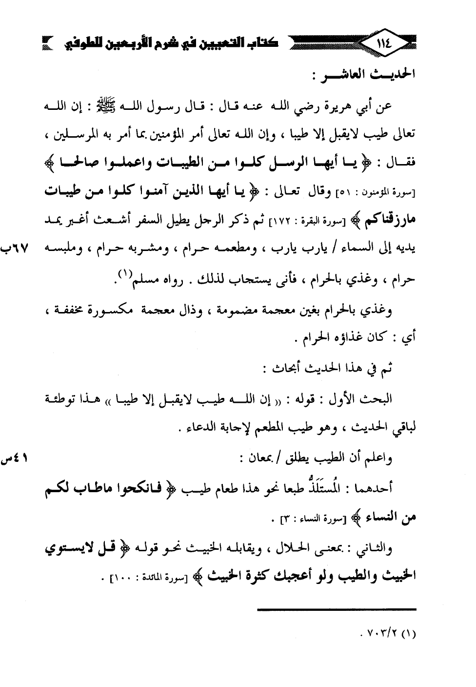 البحث الأول: قوله: "إن الله طيب لا يقبل إلا طيبا" هذا توطئة لباقي الحديث، وهو طيب المطعم لإجابة الدعاء.