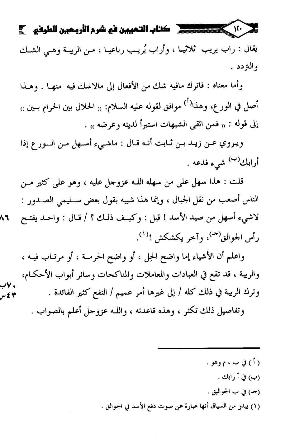واعلم أن الأشياء إما واضح الحِل، أو واضح الحرمة، أو مرتاب فيه، والريبة، قد تقع في العبادات والمعاملات والمناكحات وسائر أبواب الأحكام، وترك الريبة في ذلك كله إلى غيرها أمر عميم النفع كثير الفائدة