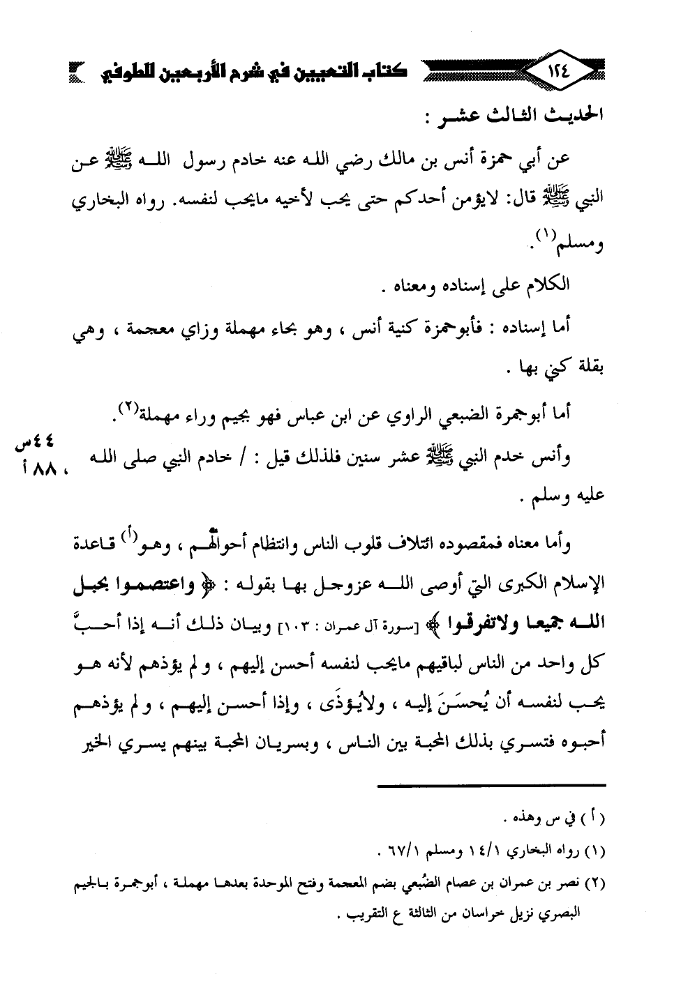 وأما معناه فمقصوده ائتلاف قلوب الناس وانتظام أحوالهم، وهو (أ) قاعدة الإسلام الكبرى التي أوصى الله عزَّ وجلَّ بها بقوله: {وَاعْتَصِمُوا بِحَبْلِ اللَّهِ جَمِيعًا وَلَا تَفَرَّقُوا} [آل عمران: 103] وبيان ذلك أنه إذا أحبَّ كل واحد من الناس لباقيهم ما يحب لنفسه أحسن إليهم، ولم يؤذهم لأنه هو يحب لنفسه أن يُحسَنَ إليه، ولا يُؤذَى، وإذا أحسن إليهم، ولم يؤذهم أحبوه فتسري بذلك المحبة بين الناس، وبسريان المحبة بينهم يسرى الخير