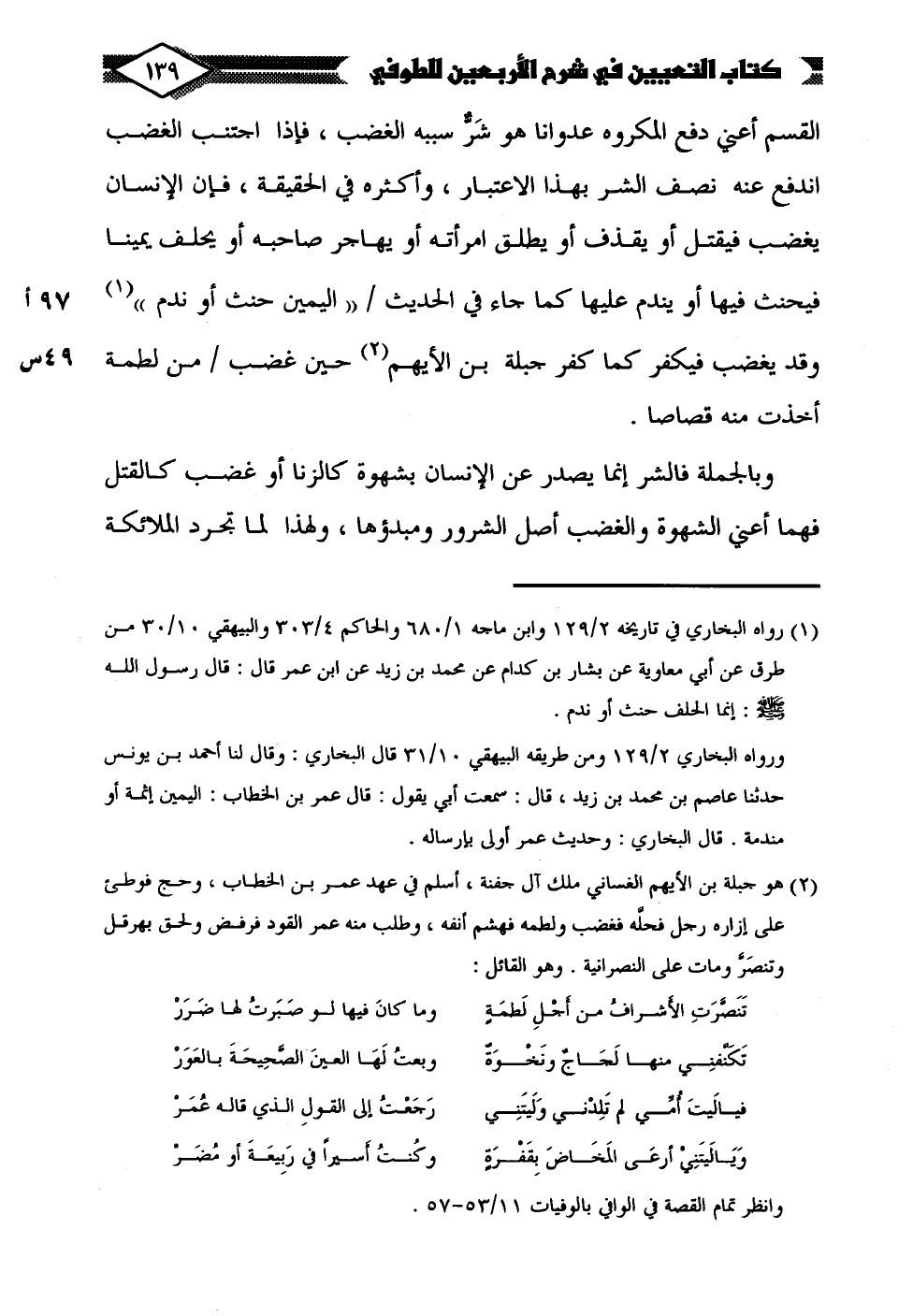 القسم أعني دفع المكروه عدوانا هو شَرٌّ سببه الغضب، فإذا اجتنب الغضب اندفع عنه نصف الشر بهذا الاعتبار، وأكثره في الحقيقة، فإن الإنسان يغضب فيقتل أو يقذف أو يطلق امرأته أو يهاجر صاحبه أو يحلف يمينًا فيحنث فيها أو يندم عليها كما جاء في الحديث "اليمين حنث أو ندم" (¬1) وقد يغضب فيكفر كما كفر جبلة بن الأيهم (¬2) حين غضب من لطمة أخذت منه قصاصا.