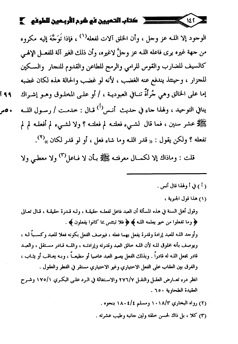 الوجود إلا الله عزَّ وجلَّ، وأن الخلق آلات لفعله (¬1)، فإذا تَوَجَّهَ إليه مكروه من جهة غيره يرى فاعله الله عزَّ وجلَّ لا غيره، وأن ذلك الغير آلة للفعل الإلهي كالسيف للضارب والقوس للرامي والرمح للطاعن والقدوم للنجار والسكين للجزار، وحينئذ يندفع عنه الغضب، لأنه لو غضب والحالة هذه لكان غضبه إما على الخالق وهي جُرأةٌ تنافي العبودية، أو على المخلوق وهو إشراك ينافي التوحيد، ولهذا جاء في حديث أنس (أ) قال: خدمت رسول الله - صلى الله عليه وسلم - عشر سنين، فما قال لشيء فعلته لم فعلته؟ ولا لشيء لم أفعله لم لم تفعله؟ ولكن يقول: "قدر الله وما شاء فعل، أو لو قدر لكان" (¬2).