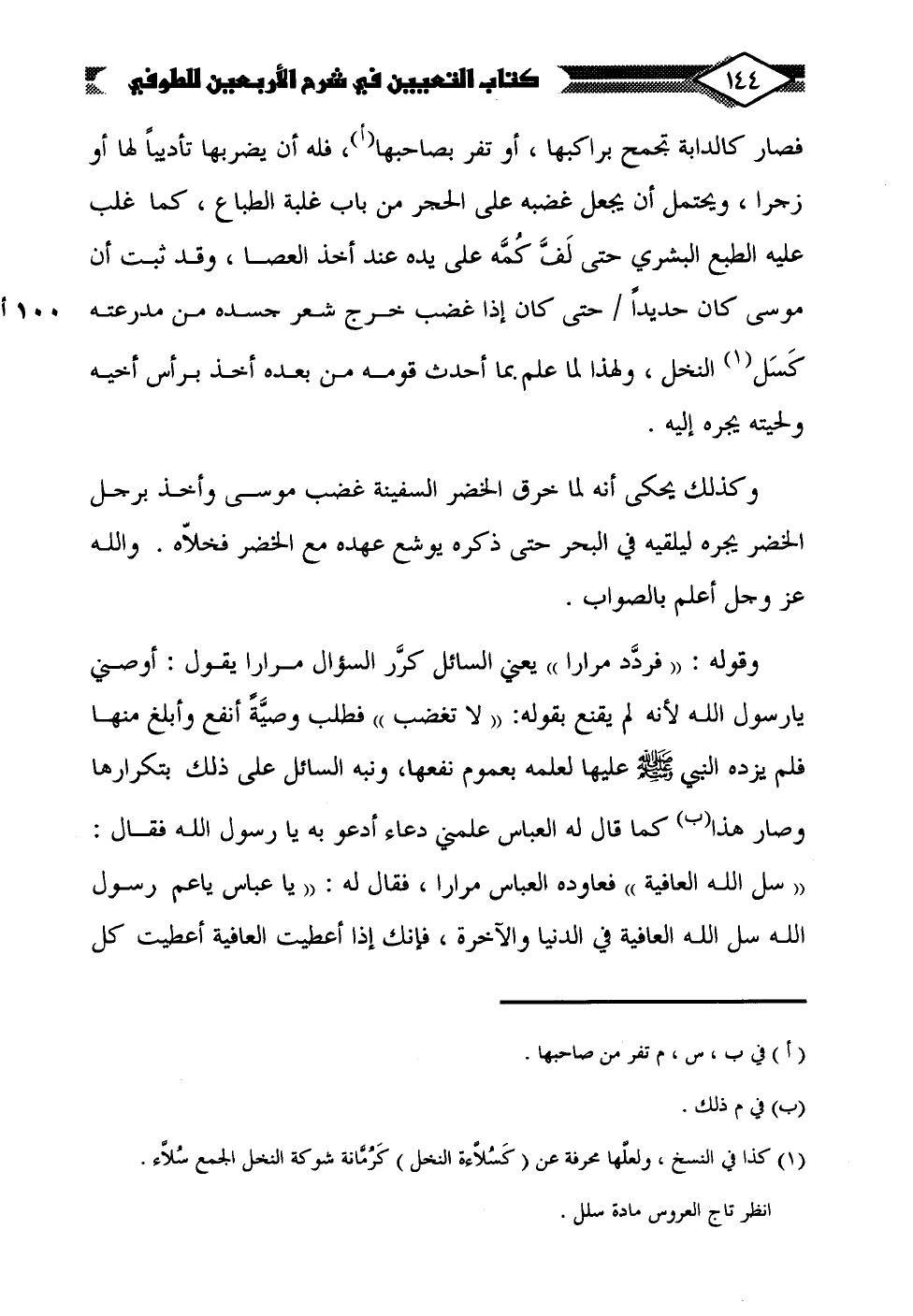فصار كالدابة تجمح براكبها، أو تفر بصاحبها (أ)، فله أن يضربها تأديبًا لها أو زجرا، ويحتمل أن يجعل غضبه على الحجر من باب غلبة الطباع، كما غلب عليه الطبع البشري حتى لَفَّ كُمَّه على يده عند أخذ العصا، وقد ثبت أن موسى كان حديدًا حتى كان إذا غضب خرج شعر جسده من مدرعته كَسَل (¬1) النخل، ولهذا لما علم بما أحدث قومه من بعده أخذ برأس أخيه ولحيته يجره إليه.