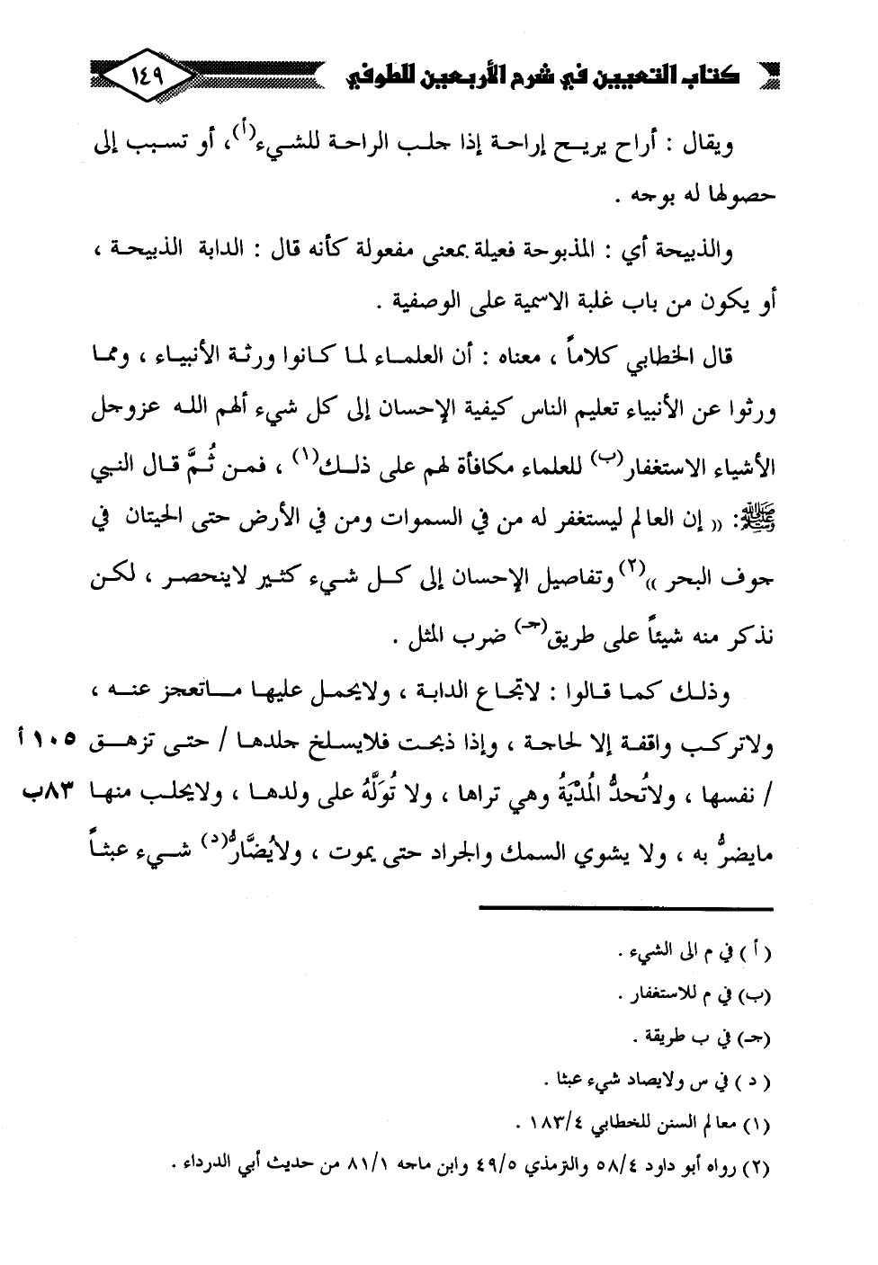 قال الخطابي كلامًا، معناه: أن العلماء لما كانوا ورثة الأنبياء، ومما ورثوا عن الأنبياء تعليم الناس كيفية الإحسان إلى كل شيء ألهم الله عز وجل الأشياء الاستغفار (ب) للعلماء مكافأة لهم على ذلك (¬1)، فمن ثُمَّ قال النبي - صلى الله عليه وسلم -: "إن العالم ليستغفر له من في السموات ومن في الأرض حتَّى الحيتان في جوف البحر" (¬2) وتفاصيل الإحسان إلى كل شيء كثير لا ينحصر، لكن نذكر منه شيئًا على طريق (جـ) ضرب المثل.