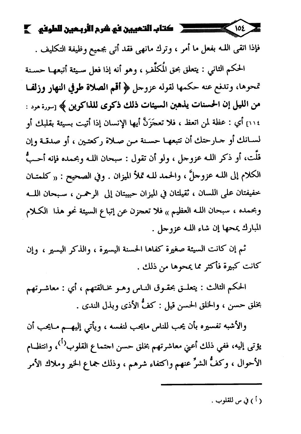 والأشبه تفسيره بأن يحب للناس ما يحب لنفسه، ويأتي إليهم ما يحب أن يؤتى إليه، ففي ذلك أعني معاشرتهم بخلق حسن اجتماع القلوب (أ)، وانتظام الأحوال، وكفُّ الشرِّ عنهم واكتفاء شرهم، وذلك جماع الخير وملاك الأمر