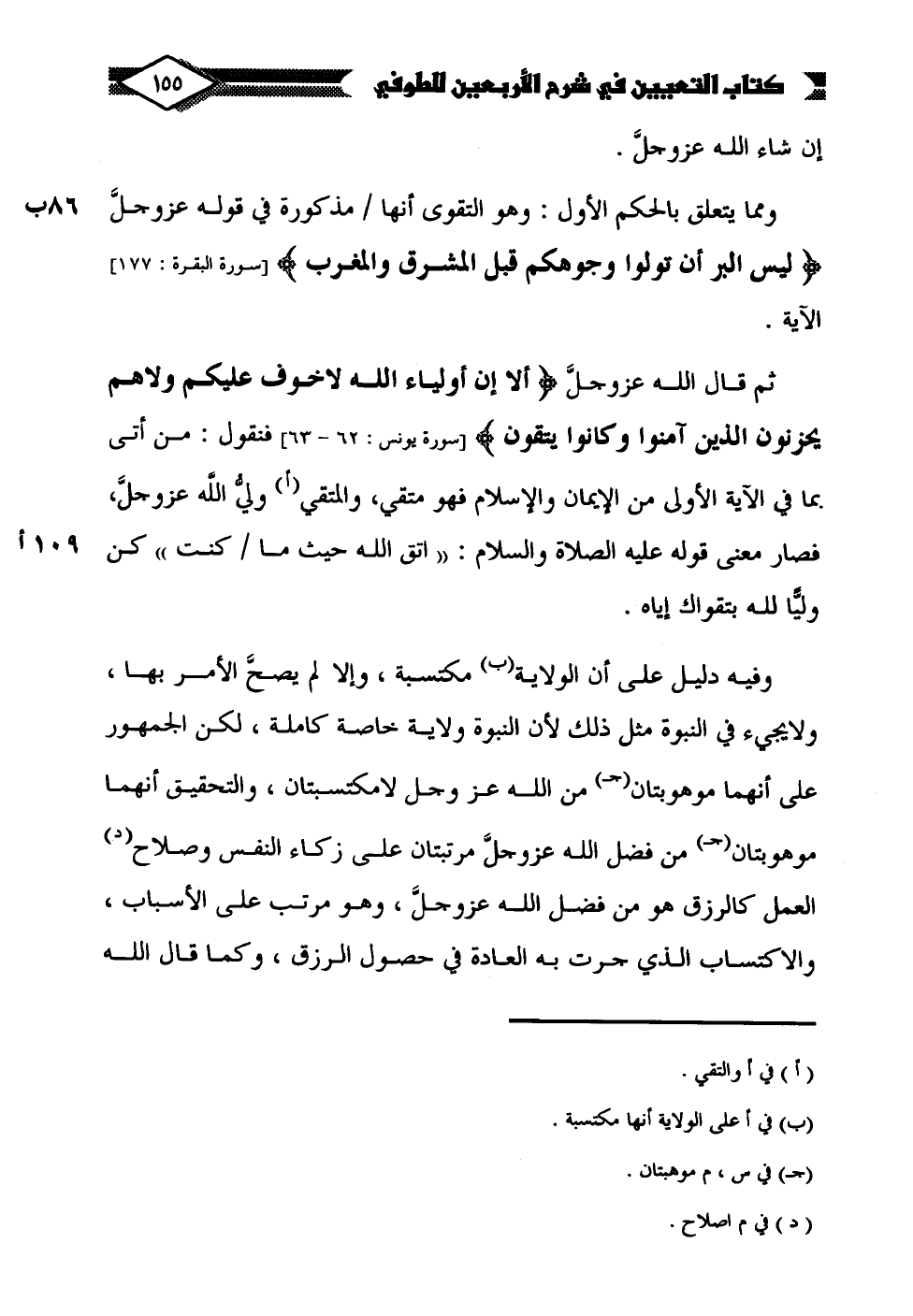 وفيه دليل على أن الولاية (ب) مكتسبة، وإلا لم يصحَّ الأمر بها، ولا يجيء في النبوة مثل ذلك لأن النبوة ولاية خاصة كاملة، لكن الجمهور على أنهما موهوبتان (جـ) من الله عز وحل لا مكتسبتان، والتحقيق أنهما موهوبتان (جـ) من فضل الله عزَّ وجلَّ، وهو مرتب على زكاء النفس وصلاح (د) العمل كالرزق هو من فضل الله عزَّ وجلَّ، وهو مرتب على الأسباب، والاكتساب الَّذي جرت به العادة في حصول الرزق، وكما قال الله