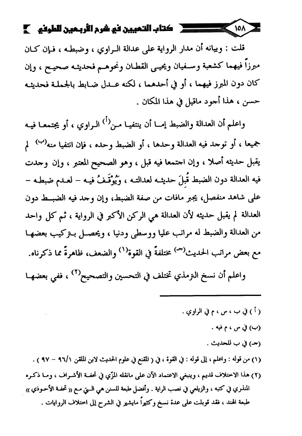 واعلم أن العدالة والضبط إما أن ينتفيا من (أ) الراوي، أو يجتمعا فيه جميعا، أو توجد فيه العدالة وحدها، أو الضبط وحده، فإن انتفيا منه (ب) لم يقبل حديثه أصلا، وإن اجتمعا فيه قبل، وهو الصحيح المعتبر، وإن وجدت فيه العدالة دون الضبط قُبِلَ حديثه لعدالته، ويُوْقَفُ فيه -لعدم ضبطه- على شاهد منفصل، يجبر ما فات من صفة الضبط، وإن وجد فيه الضبط دون العدالة لم يقبل حديثه لأن العدالة هي الركن الأكبر في الرواية، ثم كل واحد من العدالة والضبط له مراتب عليا ووسطى ودنيا، ويحصل بتركيب بعضها مع بعض مراتب الحديث (جـ) مختلفةً في القوة (¬1) والضعف، ظاهرةً مما ذكرناه.