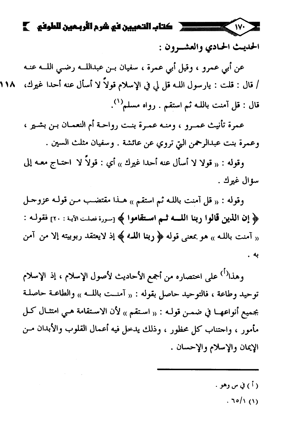 عن أبي عمرو، وقيل أبي عمرة، سفيان بن عبد الله رضي الله عنه قال: قلت: يا رسول الله قل لي في الإسلام قولًا لا أسأل عنه أحدا غيرك، قال: قل آمنت بالله ثم استقم. رواه مسلم (¬1).