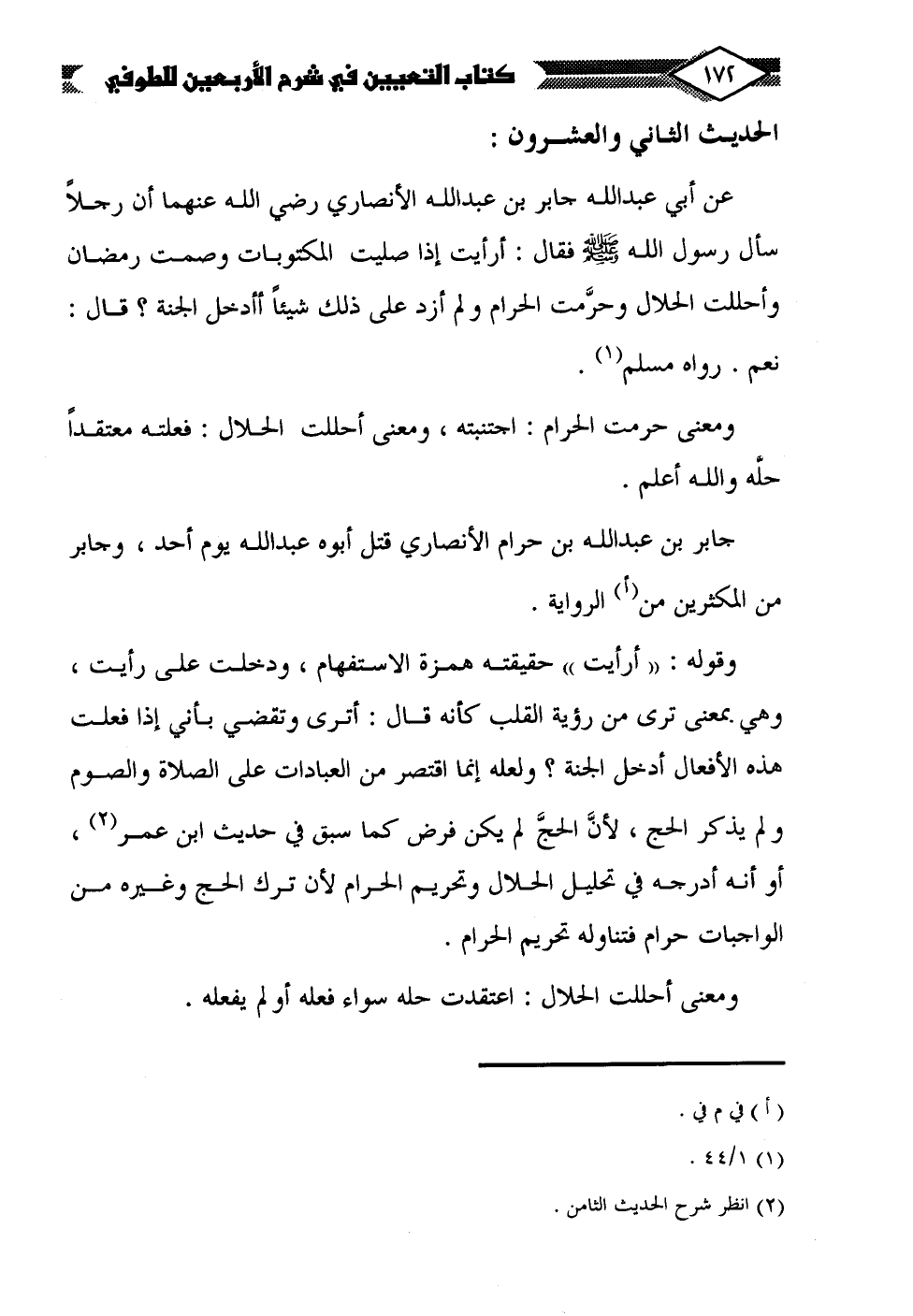 عن أبي عبد الله جابر بن عبد الله الأنصاري رضي الله عنهما أن رجلًا سأل رسول الله - صلى الله عليه وسلم - فقال: أرأيت إذا صليت المكتوبات وصمت رمضان وأحللت الحلال وحرَّمت الحرام ولم أزد على ذلك شيئًا أأدخل الجنّة؟ قال: نعم. رواه مسلم (¬1).