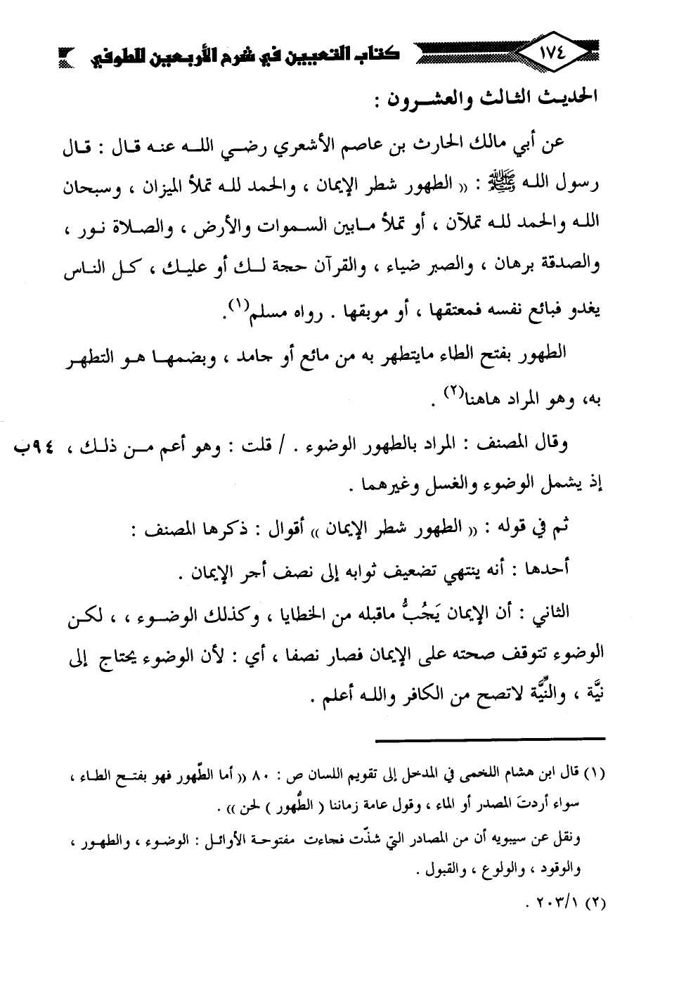 عن أبي مالك الحارث بن عاصم الأشعري رضي الله عنه قال: قال رسول الله - صلى الله عليه وسلم -: "الطهور شطر الإيمان، والحمد لله تملأ الميزان، وسبحان الله والحمد لله تملآن، أو تملأ ما بين السموات والأرض، والصلاة نور، والصدقة برهان، والصبر ضياء، والقرآن حجة لك أو عليك، كل الناس يغدو فبائع نفسه فمعتقها، أو موبقها. رواه مسلم (¬1).