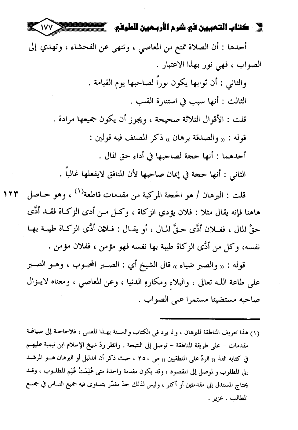 (¬1) هذا تعريف المناطقة للبرهان، ولم يرد في الكتاب والسنة بهذا المعنى، فلا حاجة إلى صياغة مقدمات -على طريقة المناطقة- توصل إلى النتيجة. وانظر ردّ شيخ الإسلام ابن تيمية عليهم في كتابه الفذ "الردّ على المنطقيين" ص 250، حيث ذكر أن الدليل أو البرهان هو المرشد إلى المطلوب والموصل إلى المقصود، وقد يكون مقدمة واحدة متى عُلِمَتْ عُلِم المطلوب، وقد يحتاج المستدل إلى مقدمتين أو أكثر، وليس لذلك حدّ مقدّر يتساوى فيه جميع الناس في جميع المطالب. عزير.