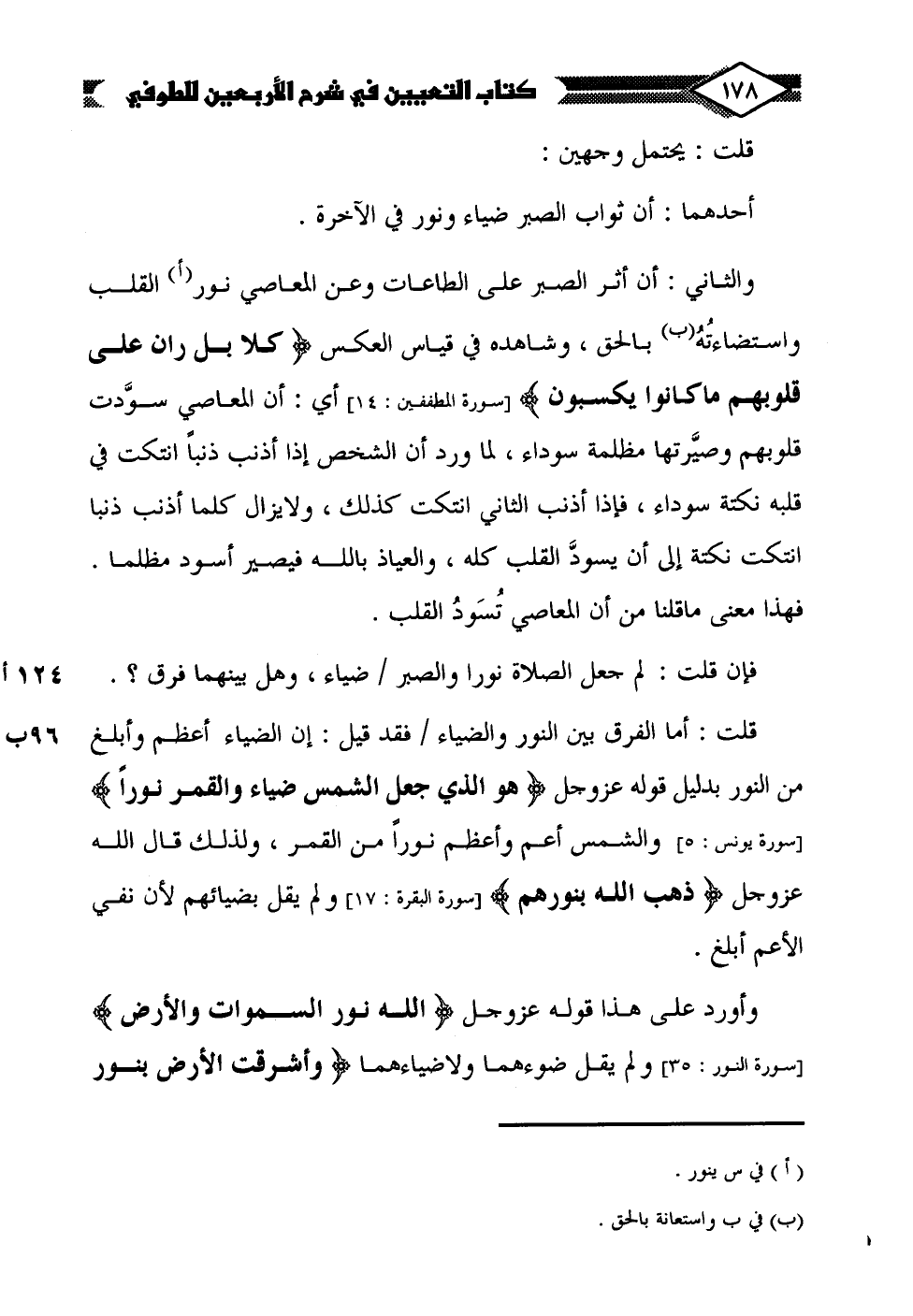 والثاني: أن أثر الصبر على الطاعات وعن المعاصي نور (أ) القلب واستضاءتُهُ (ب) بالحق، وشاهده في قياس العكس {كَلَّا بَلْ رَانَ عَلَى قُلُوبِهِمْ مَا كَانُوا يَكْسِبُونَ} [سورة المطففين: 14] أي: أن المعاصي سوَّدت قلوبهم وصيَّرتها مظلمة سوداء، لما ورد أن الشخص إذا أذنب ذنبًا انتكت في قلبه نكتة سوداء، فإذا أذنت الثاني انتكت كذلك، ولا يزال كلما أذنب ذنبا انتكت نكتة إلى أن يسودَّ القلب كله، والعياذ بالله فيصير أسود مظلما.