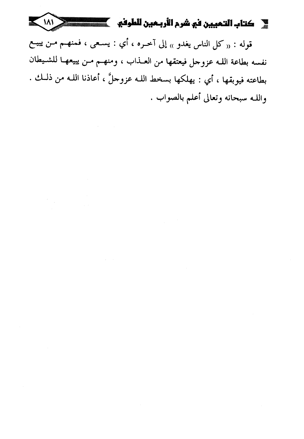 قوله: "كل الناس يغدو" إلى آخره، أي: يسعى، فمنهم من يبيع نفسه بطاعة الله عزَّ وجلَّ فيعتقها من العذاب، ومنهم من يبيعها للشيطان بطاعته فيوبقها، أي: يهلكها بسخط الله عَزَّ وَجَلَّ، أعاذنا الله من ذلك. والله سبحانه وتعالى أعلم بالصواب.