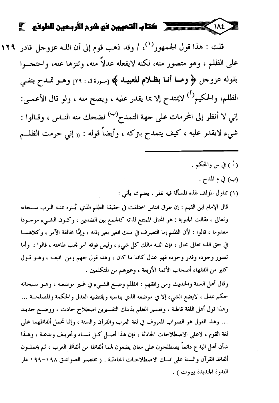 وقال أهل السنة والحديث ومن وافقهم: الظلم وضع الشيء في غير موضعه، وهو سبحانه حكم عدل، لا يضع الشيء إلا في موضعه الَّذي يناسبه ويقتضيه العدل والحكمة والمصلحة ... وهذا قول أهل اللغة قاطبة، وتفسير الظلم بذينك التفسيرين اصطلاح حادث، ووضع جديد ... وهذا القول هو الصواب المعروف في لغة العرب والقرآن والسنة، وإنما تحمل ألفاظهما على لغة القوم، لا على الاصطلاحات الحادثة، فإن هذا أصل كل فساد وتحريف وبدعة، وهذا شأن أهل البدع دائمًا يصطلحون على معان يضعون لهما ألفاظا من ألفاظ العرب، ثم يحملون ألفاظ القرآن والسنة على تلك الاصطلاحات الحادثة. (مختصر الصواعق 198 - 199 دار الندوة الجديدة بيروت).
