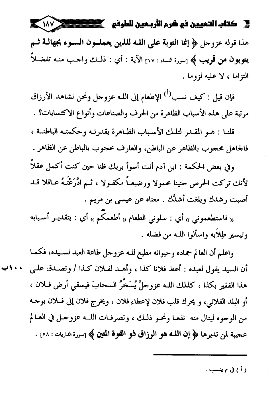 فإن قيل: كيف نسب (أ) الإطعام إلى الله عزَّ وجلَّ ونحن نشاهد الأرزاق مرتبة على هذه الأسباب الظاهرة من الحرف والصناعات وأنواع الاكتسابات؟.