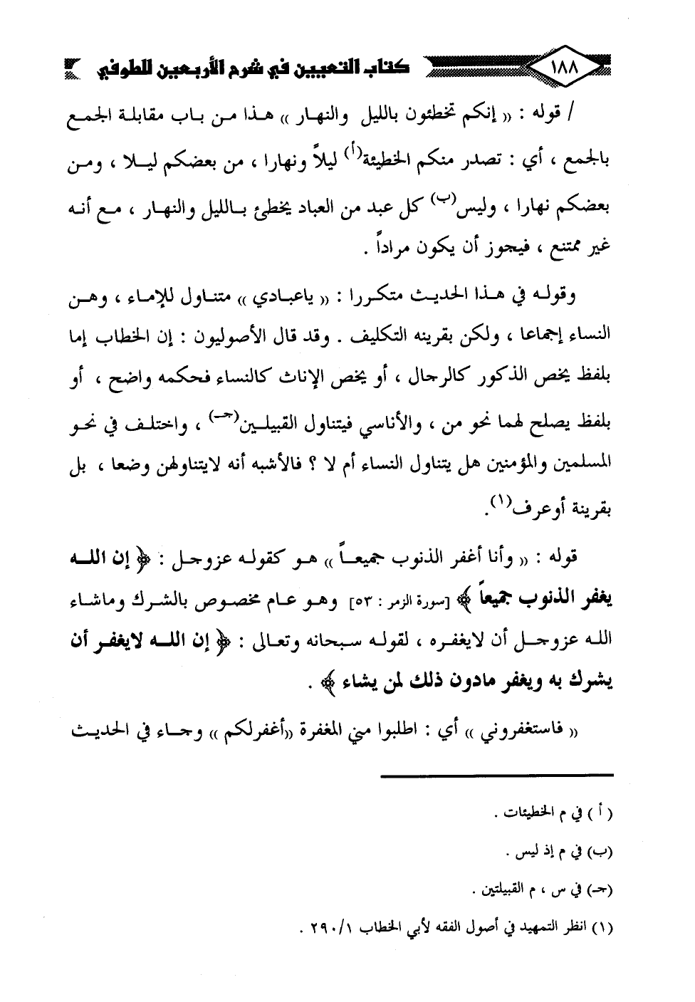 قوله: "إنكم تخطئون بالليل والنهار" هذا من باب مقابلة الجمع بالجمع، أي: تصدر منكم الخطيئة (أ) ليلًا ونهارا، من بعضكم ليلا، ومن بعضكم نهارا، وليس (ب) كل عبد من العباد يخطئ بالليل والنهار، مع أنَّه غير ممتنع، فيجوز أن يكون مرادًا.