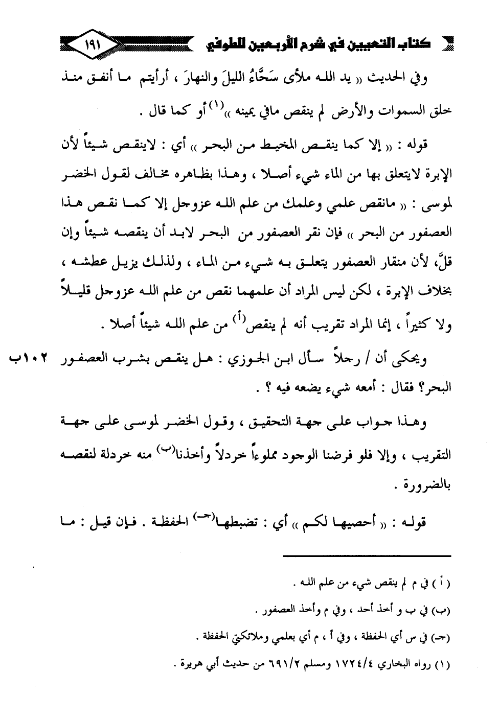 قوله: "إلا كما ينقص المخيط من البحر" أي: لا ينقص شيئًا لأن الإبرة لا يتعلق بها من الماء شيء أصلا، وهذا بظاهره مخالف لقول الخضر لموسى: "ما نقص علمي وعلمك من علم الله عزَّ وجلَّ إلا كما نقص هذا العصفور من البحر" فإن نقر العصفور من البحر لا بد أن ينقصه شيئًا وإن قلَّ، لأن منقار العصفور يتعلق به شيء من الماء، ولذلك يزيل عطشه، بخلاف الإبرة، لكن ليس المراد أن علمهما نقص من علم الله عزَّ وجلَّ قليلًا ولا كثيرًا، إنما المراد تقريب أنَّه لم ينقص (أ) من علم الله شيئًا أصلًا.