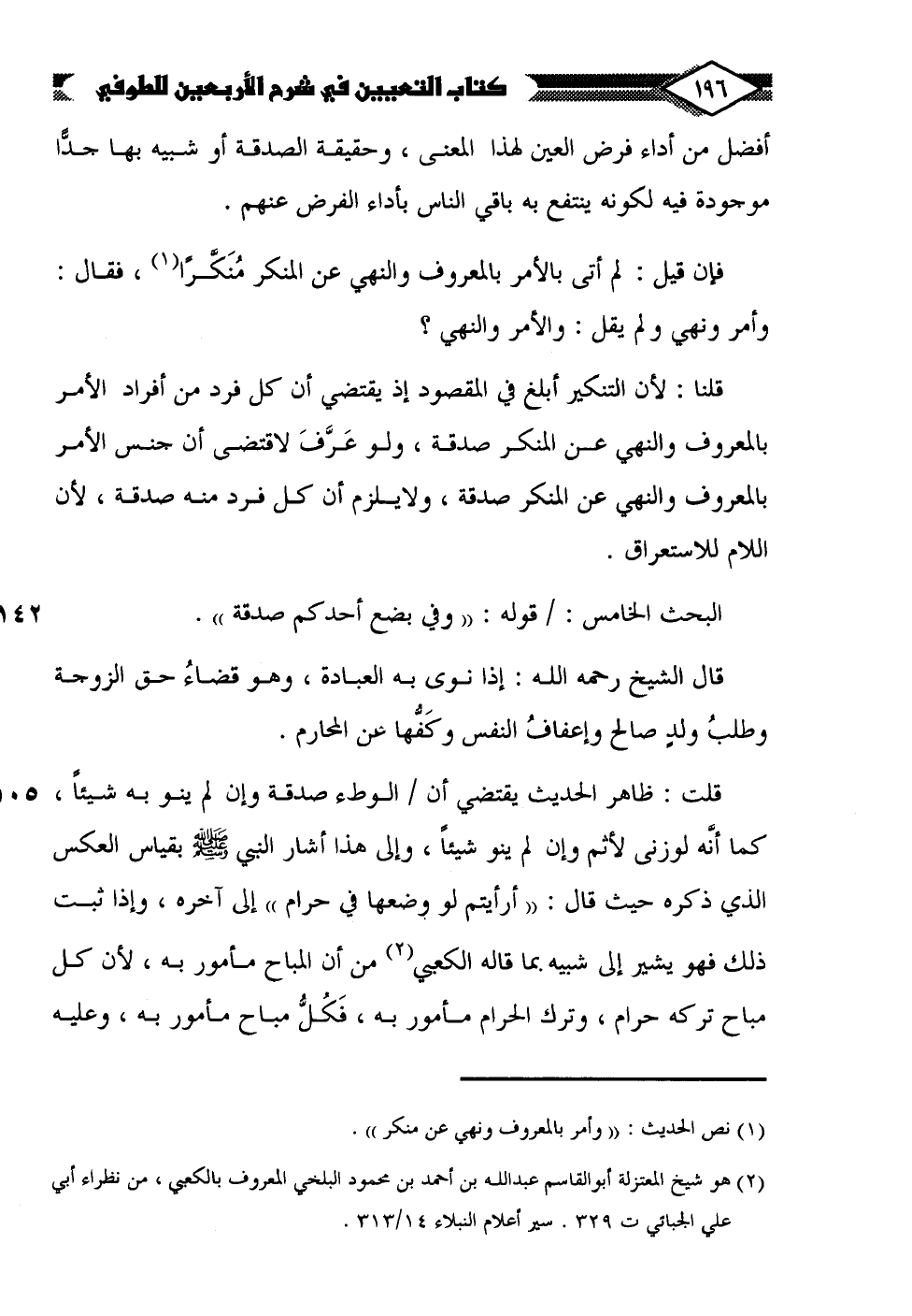 قلنا: لأن التنكير أبلغ في المقصود إذ يقتضي أن كل فرد من أفراد الأمر بالمعروف والنهي عن المنكر صدقة، ولو عَرَّفَ لاقتضى أن جنس الأمر بالمعروف والنهي عن المنكر صدقة، ولا يلزم أن كل فرد منه صدقة، لأن اللام للاستغراق.