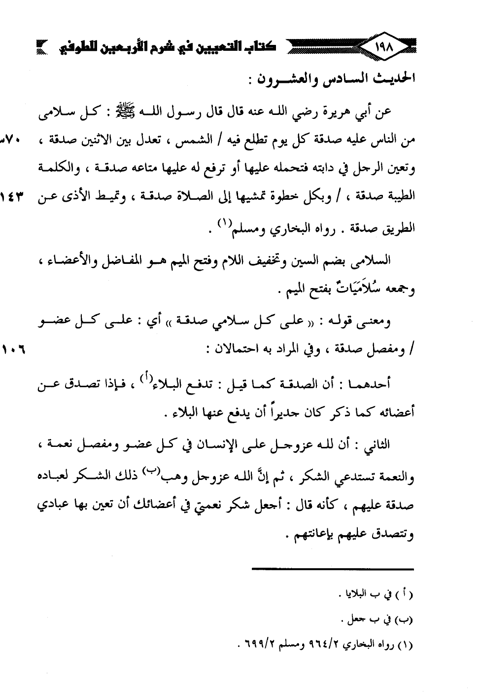 عن أبي هريرة رضي الله عنه قال قال رسول الله - صلى الله عليه وسلم -: كل سلامى من الناس عليه صدقة كل يوم تطلع فيه الشمس، تعدل بين الاثنين صدقة، وتعين الرحل في دابته فتحمله عليها أو ترفع له عليها متاعه صدقة، والكلمة الطيبة صدقة، وبكل خطوة تمشيها إلى الصلاة صدقة، وتميط الأذى عن الطريق صدقة. رواه البخاري ومسلم (¬1).