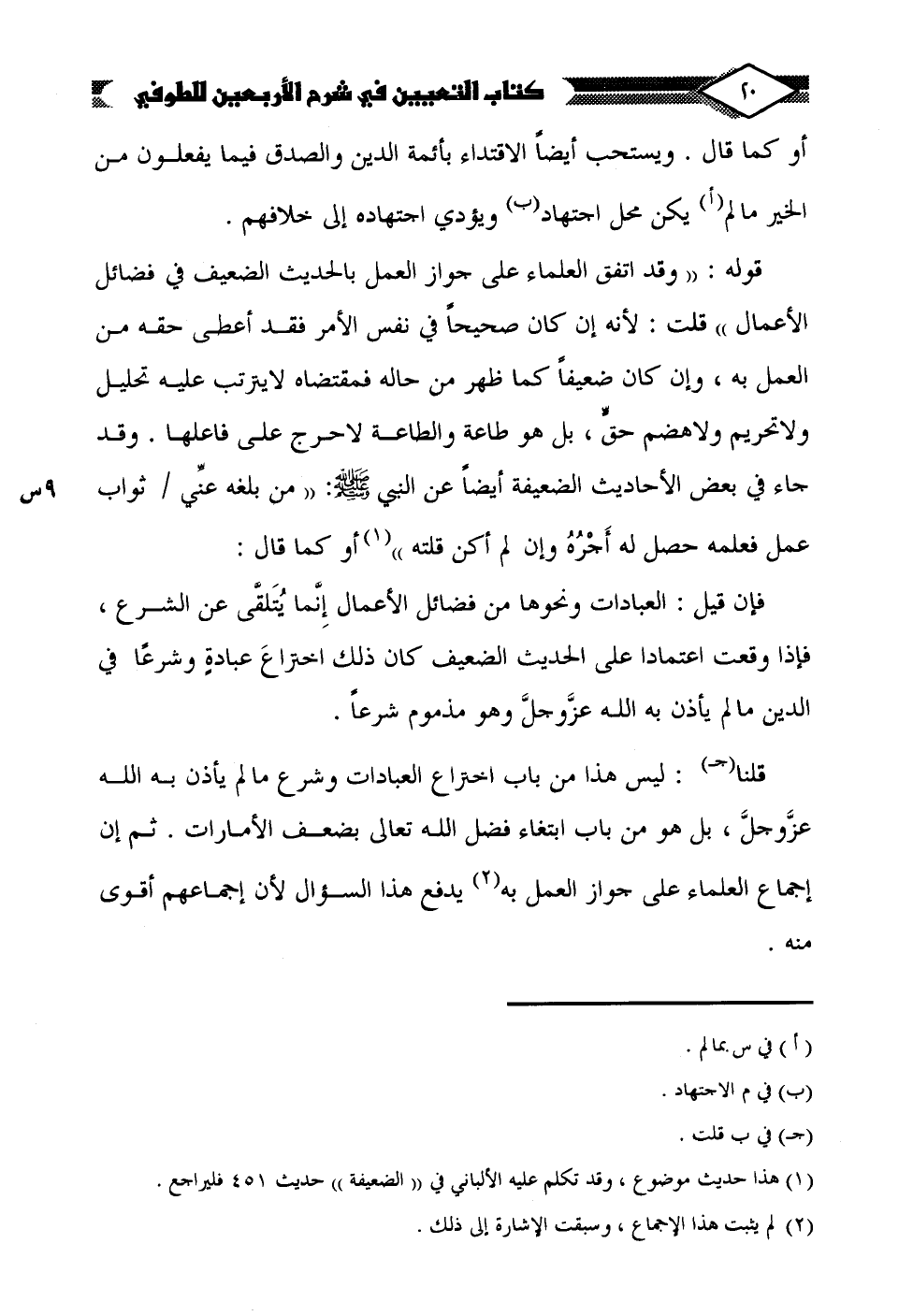 قوله: "وقد اتفق العلماء على جواز العمل بالحديث الضعيف في فضائل الأعمال" قلت: لأنَّه إن كان صحيحًا في نفس الأمر فقد أعطى حقه من العمل به، وإن كان ضعيفًا كما ظهر من حاله فمقتضاه لا يترتب عليه تحليل ولا تحريم ولا هضم حقٍّ، بل هو طاعة والطاعة لا حرج على فاعلها. وقد جاء في بعض الأحاديث الضعيفة أيضًا عن النبي - صلى الله عليه وسلم -: "من بلغه عنِّي ثواب عمل فعلمه حصل له أَجرُهُ وإن لم أكن قلته" (¬1) أو كما قال: