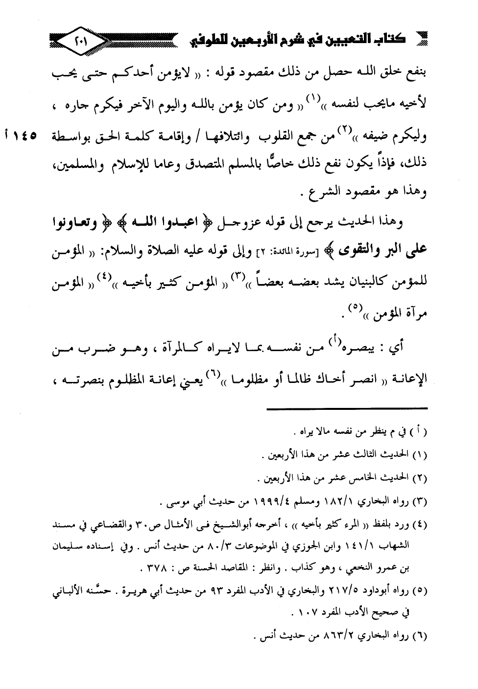 وهذا الحديث يرجع إلى قوله عزَّ وجلَّ {اعْبُدُوا اللَّهَ} {وَتَعَاوَنُوا عَلَى الْبِرِّ وَالتَّقْوَى} [المائدة: 2] وإلى قوله عليه الصلاة والسلام: "المؤمن للمؤمن كالبنيان يشد بعضه بعضًا" (¬3) "المؤمن كثير بأخيه" (¬4) "المؤمن مرآة المؤمن" (¬5).