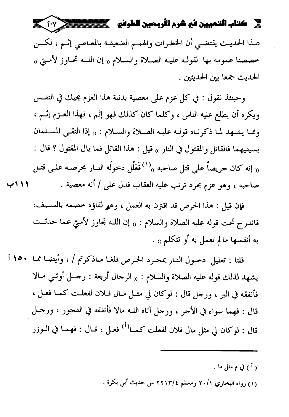 قلنا: تعليل دخول النار بمجرد الحرص فلغا ما ذكرتم، وأيضًا مما يشهد لذلك قوله عليه الصلاة والسلام: "الرجال أربعة: رجل أوتي مالا فأنفقه في البر، ورجل قال: لو كان لي مثل مال فلان لفعلت كما فعل، قال: فهما سواء في الأجر، ورجل آتاه الله مالا فأنفقه في الفجور، ورجل قال: لو كان لي مثل مال فلان لفعلت كما (أ) فعل، قال: فهما في الوزر