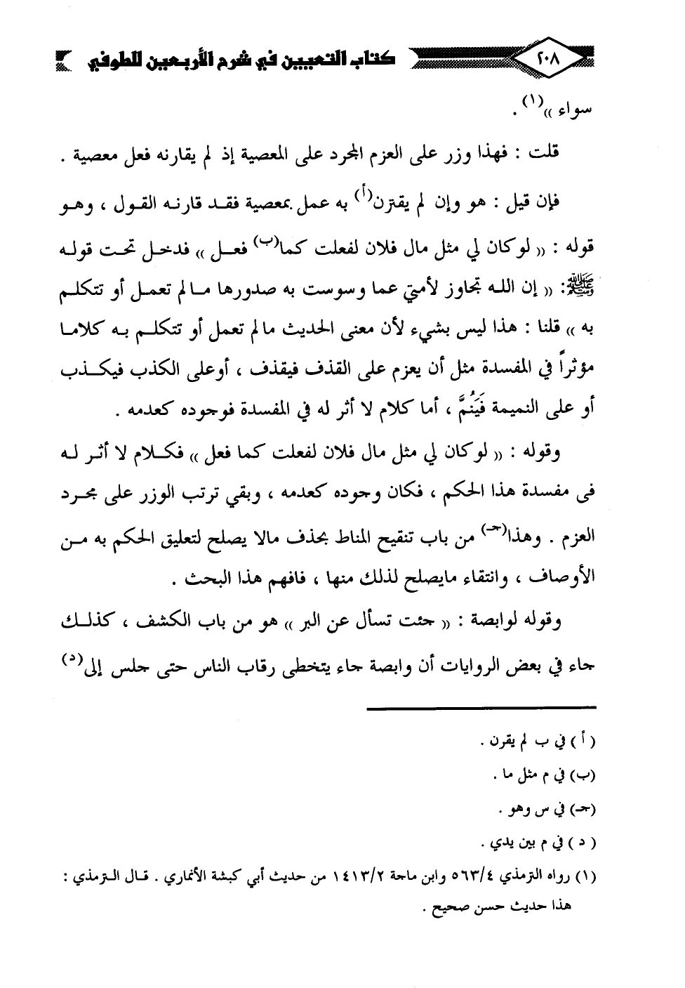 وقوله: "لو كان لي مثل مال فلان لفعلت كما فعل" فكلام لا أثر له في مفسدة هذا الحكم، فكان وجوده كعدمه، وبقي ترتب الوزر على مجرد العزم. وهذا (جـ) من باب تنقيح المناط بحذف ما لا يصلح لتعليق الحكم به من الأوصاف، وانتقاء ما يصلح لذلك منها، فافهم هذا البحث.