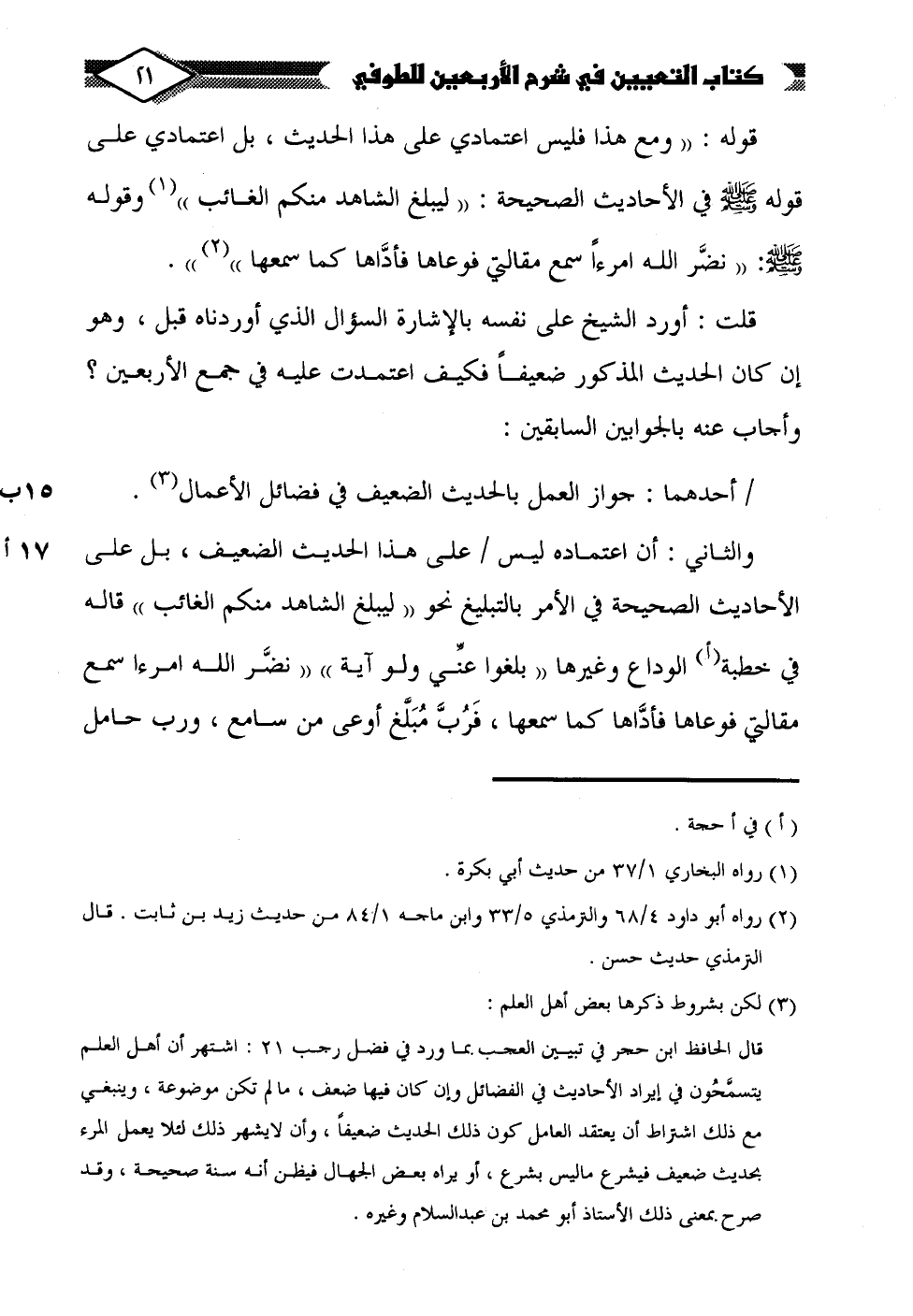 والثاني: أن اعتماده ليس على هذا الحديث الضعيف، بل على الأحاديث الصحيحة في الأمر بالتبليغ نحو "ليبلغ الشاهد منكم الغائب" قاله في خطبة (أ) الوداع وغيرها "بلغوا عنِّي ولو آية" "نضَّر الله امرءا سمع مقالتي فوعاها فأدَّاها كما سمعها، فَرُبَّ مُبَلَّغ أوعى من سامع، ورب حامل