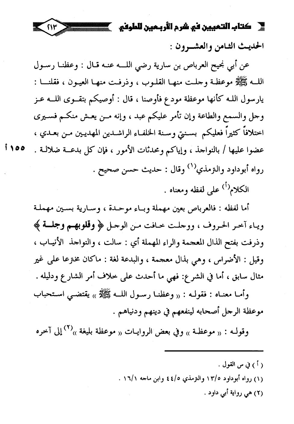 أما لفظه: فالعرباص بعين مهملة وباء موحدة، وسارية بسين مهملة وياء آخر الحروف، ووجلت خافت من الوجل {وَقُلُوبُهُمْ وَجِلَةٌ} وذرفت بفتح الذال المعجمة والراء المهملة أي: سالت، والنواجذ الأنياب، وقيل: الأضراس، وهي بذال معجمة، والبدعة لغة: ما كان مخترعا على غير مثال سابق، أما في الشرع: فهي ما أحدث على خلاف أمر الشارع ودليله.