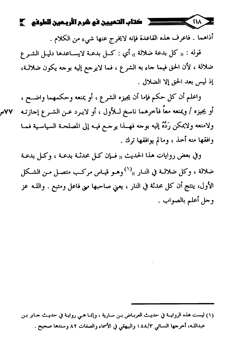 وفي بعض روايات هذا الحديث "فإن كل محدثة بدعة، وكل بدعة ضلالة، وكل ضلالة في النار" (¬1) وهو قياس مركب متصل من الشكل الأول، ينتج أن كل محدثة في النار، يعني صاحبها من فاعل ومتبع. والله عز وجل أعلم بالصواب.