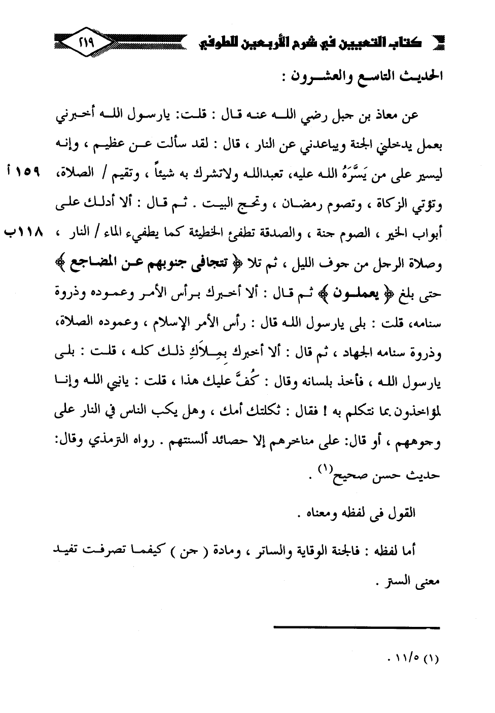 عن معاذ بن جبل رضي الله عنه قال: قلت: يا رسول الله أخبرني بعمل يدخلي الجنة ويباعدني عن النار، قال: لقد سألت عن عظيم، وإنه ليسير على من يَسَّرَهُ الله عليه، تعبد الله ولا تشرك به شيئًا، وتقيم الصلاة، وتؤتي الزكاة، وتصوم رمضان، وتحج البيت. ثم قال: ألا أدلك على أبواب الخير، الصوم جنة، والصدقة تطفئ الخطيئة كما يطفيء الماء النار، وصلاة الرجل من جوف الليل، ثم تلا {تَتَجَافَى جُنُوبُهُمْ عَنِ الْمَضَاجِعِ} حتى بلغ {يَعْمَلُونَ} قال: ألا أخبرك برأس الأمر وعموده وذروة سنامه، قلت: بلى يا رسول الله قال: رأس الأمر الإسلام، وعموده الصلاة، وذروة سنامه الجهاد، ثم قال: ألا أخبرك بِمِلاَكِ ذلك كله، قلت: بلى يا رسول الله، فأخذ بلسانه وقال: كُفَّ عليك هذا، قلت: يا نبي الله وإنا لمؤاخذون بما نتكلم به! فقال: ثكلتك أمك، وهل يكب الناس في النار على وجوههم، أو قال: على مناخرهم إلا حصائد ألسنتهم. رواه الترمذي وقال: حديث حسن صحيح (¬1).