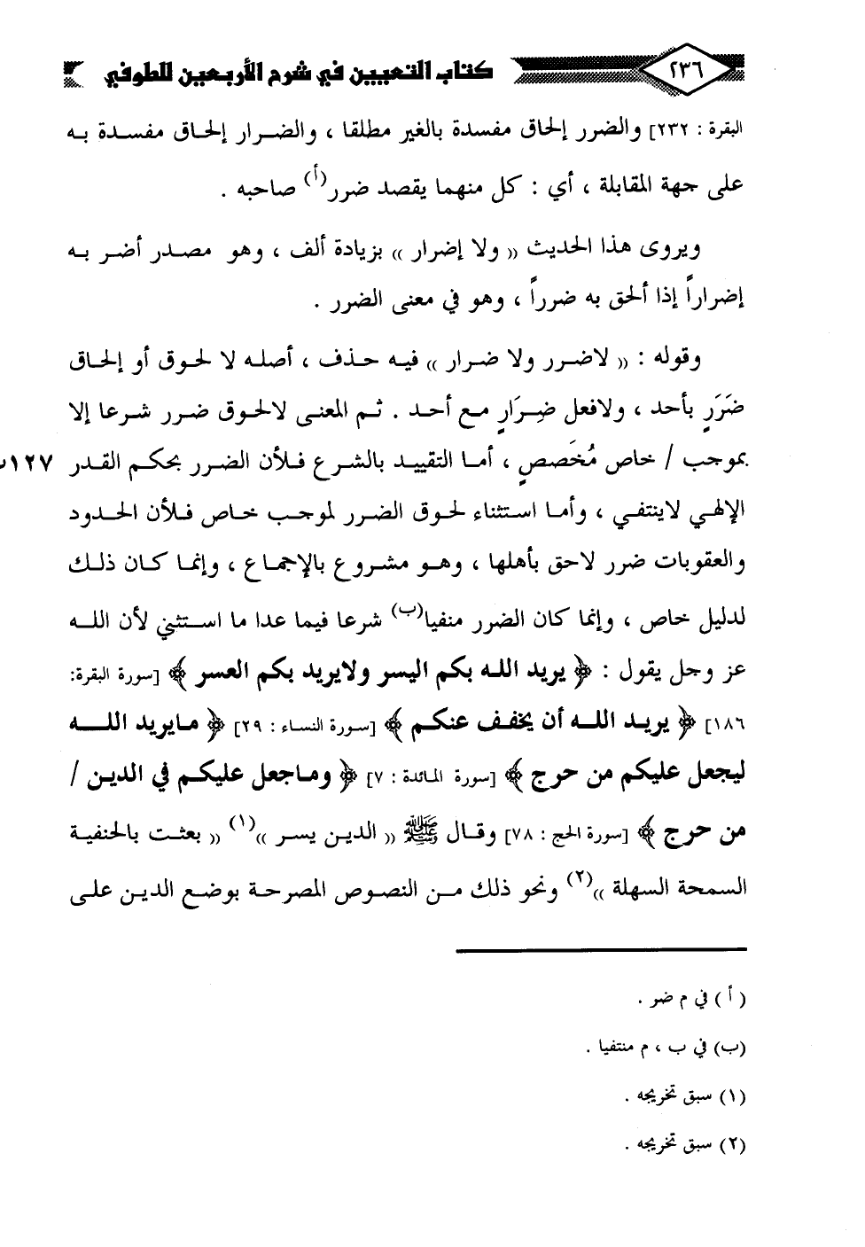 وقوله: "لا ضرر ولا ضرار" فيه حذف، أصله لا لحوق أو إلحاق ضَرَرٍ بأحد، ولا فعل ضِرَارٍ مع أحد. ثم المعنى لا لحوق ضرر شرعا إلا بموجب خاص مُخَصصٍ، أما التقييد بالشرع فلأن الضرر بحكم القدر الإلهي لا ينتفي، وأما استثناء لحوق الضرر لموجب خاص فلأن الحدود والعقوبات ضرر لاحق بأهلها، وهو مشروع بالإجماع، وإنما كان ذلك لدليل خاص، وإنما كان الضرر منفيا (ب) شرعا فيما عدا ما استثني لأن الله عزَّ وجلَّ يقول: {يُرِيدُ اللَّهُ بِكُمُ الْيُسْرَ وَلَا يُرِيدُ بِكُمُ الْعُسْرَ} [البقرة: 185] {يُرِيدُ اللَّهُ أَنْ يُخَفِّفَ عَنْكُمْ} [النساء: 28] {مَا يُرِيدُ اللَّهُ لِيَجْعَلَ عَلَيْكُمْ مِنْ حَرَجٍ} [المائدة: 6] {وَمَا جَعَلَ عَلَيْكُمْ فِي الدِّينِ مِنْ حَرَجٍ} [الحج: 78] وقال - صلى الله عليه وسلم - "الدين يسر" (¬1) "بعثت بالحنفية السمحة السهلة" (¬2) ونحو ذلك من النصوص المصرحة بوضع الدين على