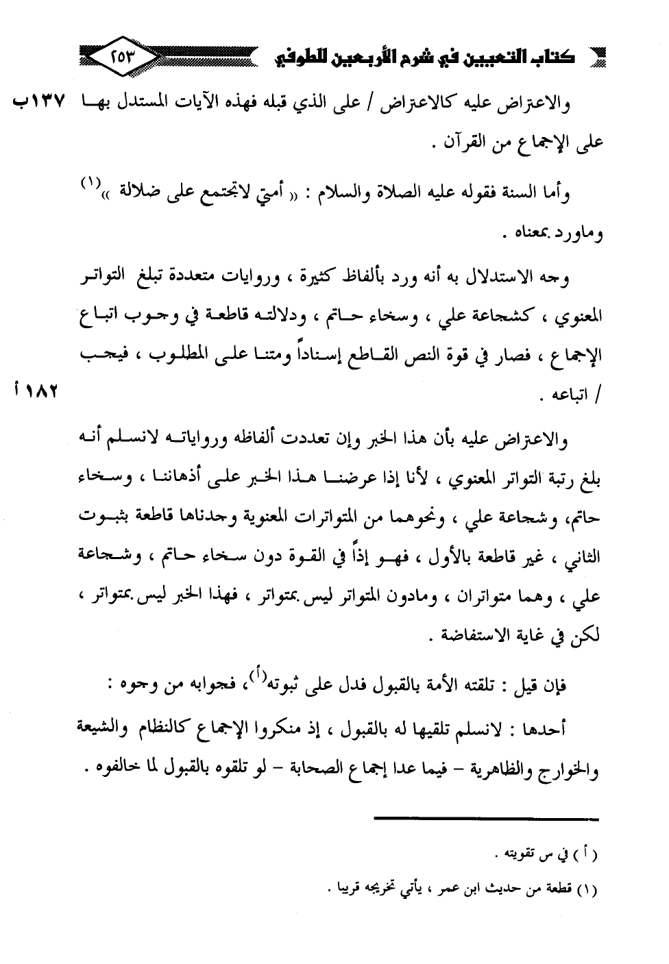 والاعتراض عليه بأن هذا الخبر وإن تعددت ألفاظه ورواياته لا نسلم أنه بلغ رتبة التواتر المعنوي، لأنا إذا عرضنا هذا الخبر على أذهاننا، وسخاء حاتم، وشجاعة علي، ونحوهما من المتواترات المعنوية وجدناها قاطعة بثبوت الثاني، غير قاطعة بالأول، فهو إذًا في القوة دون سخاء حاتم، وشجاعة علي، وهما متواتران، وما دون المتواتر ليس بمتواتر، فهذا الخبر ليس بمتواتر، لكن في غاية الاستفاضة.