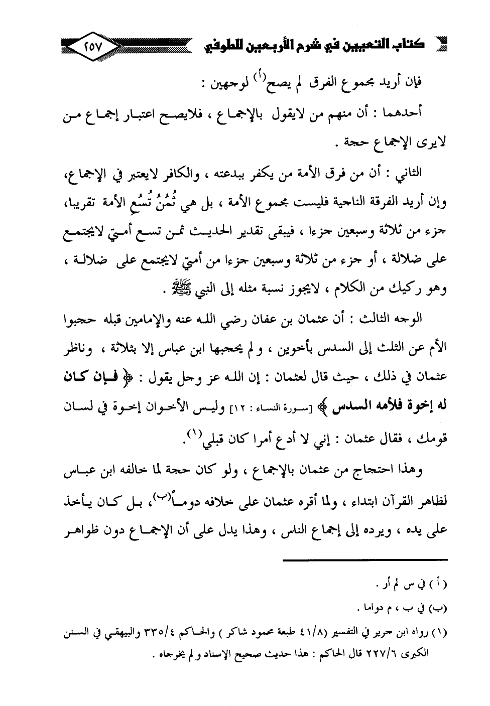 وهذا احتجاج من عثمان بالإجماع، ولو كان حجة لما خالفه ابن عباس لظاهر القرآن ابتداء، ولما أقره عثمان على خلافه دومًا (ب)، بل كان يأخذ على يده، ويرده إلى إجماع الناس، وهذا يدل على أن الإجماع دون ظواهر