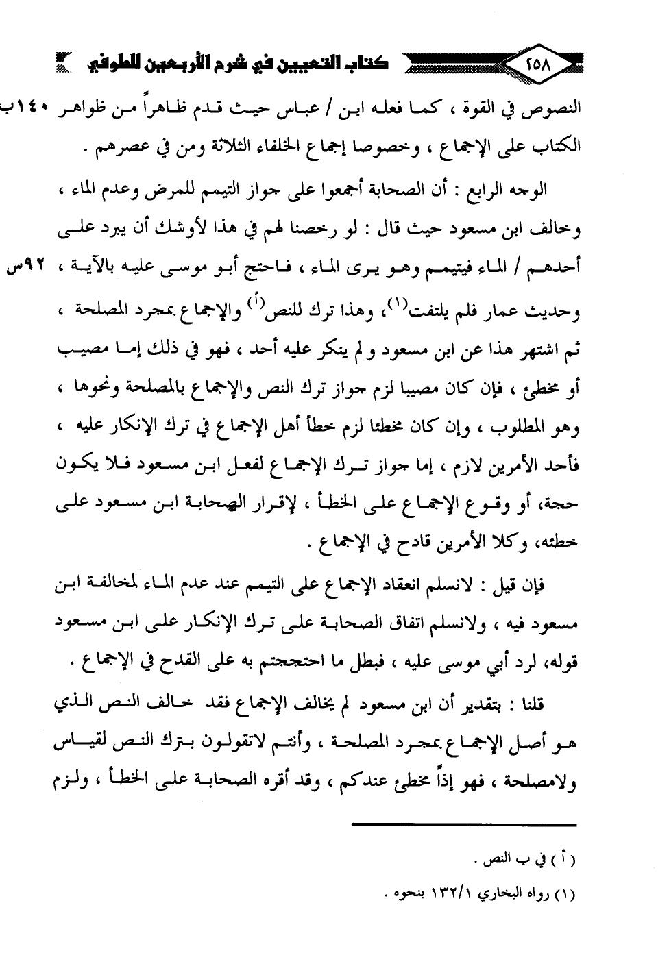 الوجه الرابع: أن الصحابة أجمعوا على جواز التيمم للمرض وعدم الماء، وخالف ابن مسعود حيث قال: لو رخصنا لهم في هذا لأوشك أن يبرد على أحدهم الماء فيتيمم وهو يرى الماء، فاحتج أبو موسى عليه بالآية، وحديث عمار فلم يلتفت (¬1)، وهذا ترك للنص (أ) والإجماع بمجرد المصلحة، ثم اشتهر هذا عن ابن مسعود ولم ينكر عليه أحد، فهو في ذلك إما مصيب أو مخطئ، فإن كان مصيبا لزم جواز ترك النص والإجماع بالمصلحة ونحوها، وهو المطلوب، وإن كان مخطئا لزم خطأ أهل الإجماع في ترك الإنكار عليه، فأحد الأمرين لازم، إما جواز ترك الإجماع لفعل ابن مسعود فلا يكون حجة، أو وقوع الإجماع على الخطأ، لإقرار الصحابة ابن مسعود على خطئه، وكلا الأمرين قادح في الإجماع.