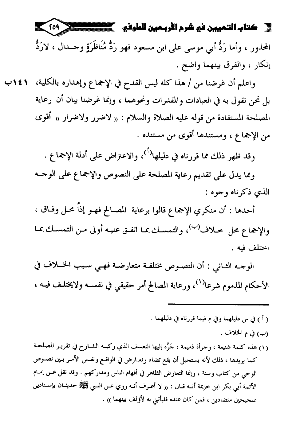 واعلم أن غرضنا من هذا كله ليس القدح في الإجماع وإهداره بالكلية، بل نحن نقول به في العبادات والمقدرات ونحوهما، وإنما غرضنا بيان أن رعاية المصلحة المستفادة من قوله عليه الصلاة والسلام: "لا ضرر ولا ضرار" أقوى من الإجماع، ومستندها أقوى من مستنده.