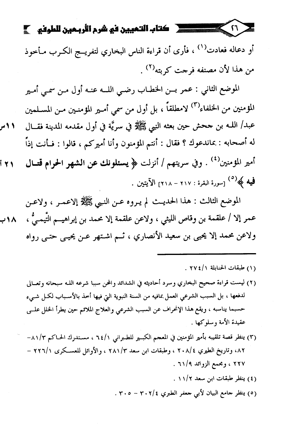 الموضع الثَّاني: عمر بن الخطاب رضي الله عنه أول من سمي أمير المؤمنين من الخلفاء (¬3) لا مطلقًا، بل أول من سمي أمير المؤمنين من المسلمين عبد الله بن جحش حين بعثه النبي - صلى الله عليه وسلم - في سريَّة في أول مقدمه المدينة فقال له أصحابه: بما ندعوك؟ فقال: أنتم المؤمنون وأنا أميركم، قالوا: فأنت إذًا أمير المؤمنين (¬4). وفي سريتهم أنزلت {يَسْأَلُونَكَ عَنِ الشَّهْرِ الْحَرَامِ قِتَالٍ فِيهِ} (¬5) [سورة البقرة: 217 - 218] الآيتين.