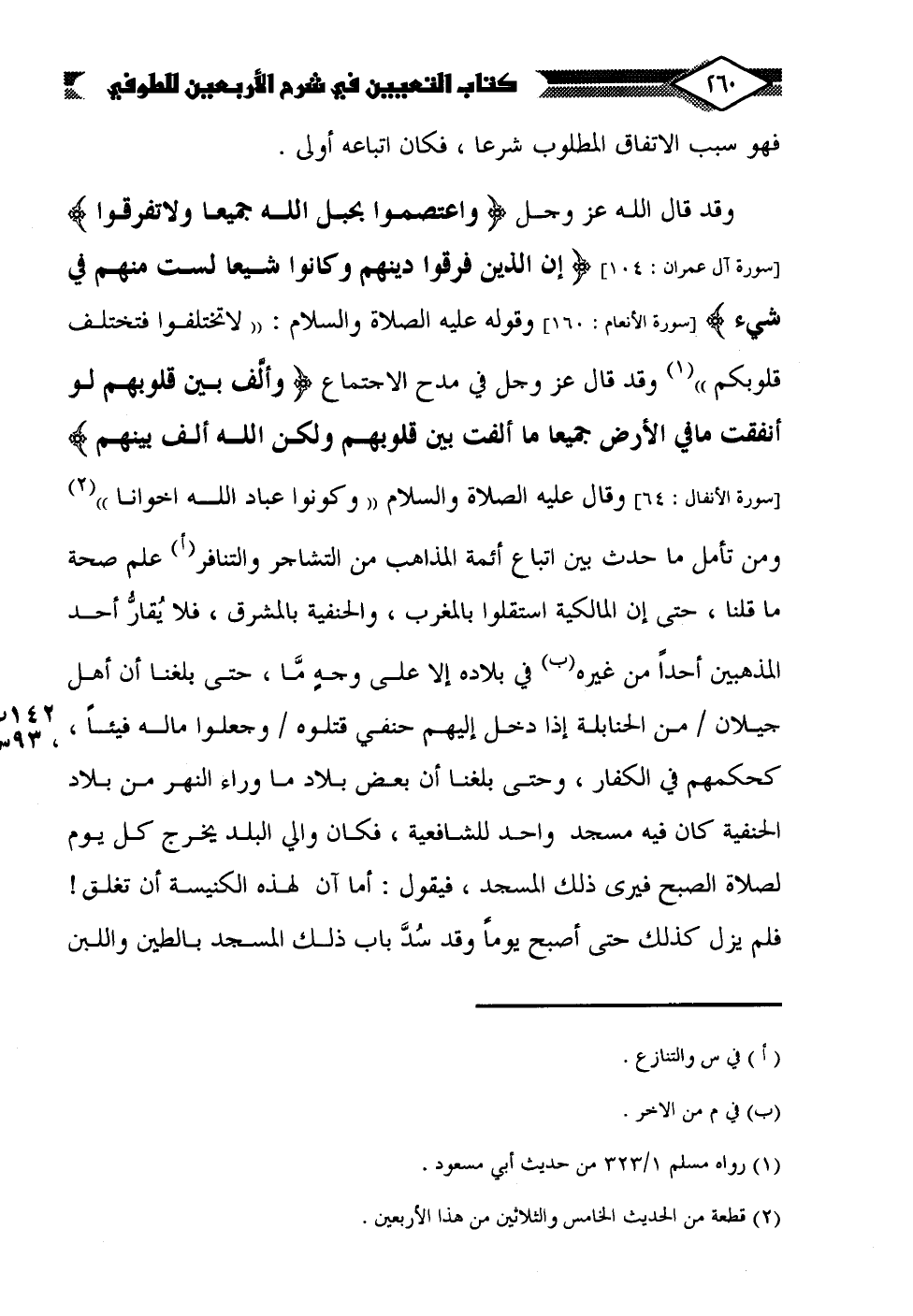 وقد قال الله عزَّ وجلَّ {واعتصموا بحبل الله جميعا ولا تفرقوا} [سورة آل عمران: 104] {إن الذين فرقوا دينهم وكانوا شيعا لست منهم في شيء} [سورة الأنعام: 160] وقوله عليه الصلاة والسلام: "لا تختلفوا فتختلف قلوبكم" (¬1) وقد قال عزَّ وجلَّ في مدح الاجتماع {وألَّف بين قلوبهم لو أنفقت ما في الأرض جميعا ما ألفت بين قلوبهم ولكن الله ألف بينهم} [سورة الأنفال: 64] وقال عليه الصلاة والسلام "وكونوا عباد الله اخوانا" (¬2) ومن تأمل ما حدث بين اتباع أئمة المذاهب من التشاجر والتنافر (أ) علم صحة ما قلنا، حتى إن المالكية استقلوا بالمغرب، والحنفية بالمشرق، فلا يُقارُّ أحد المذهبين أحدًا من غيره (ب) في بلاده إلا على وجهٍ ما، حتى بلغنا أن أهل جيلان من الحنابلة إذا دخل إليهم حنفي قتلوه وجعلوا ماله فيئًا، كحكمهم في الكفار، وحتى بلغنا أن بعض بلاد ما وراء النهر من بلاد الحنفية كان فيه مسجد واحد للشافعية، فكان والي البلد يخرج كل يوم لصلاة الصبح فيرى ذلك المسجد، فيقول: أما آن لهذه الكنيسة أن تغلق! فلم يزل كذلك حتى أصبح يومًا وقد سُدَّ باب ذلك المسجد بالطين واللبن