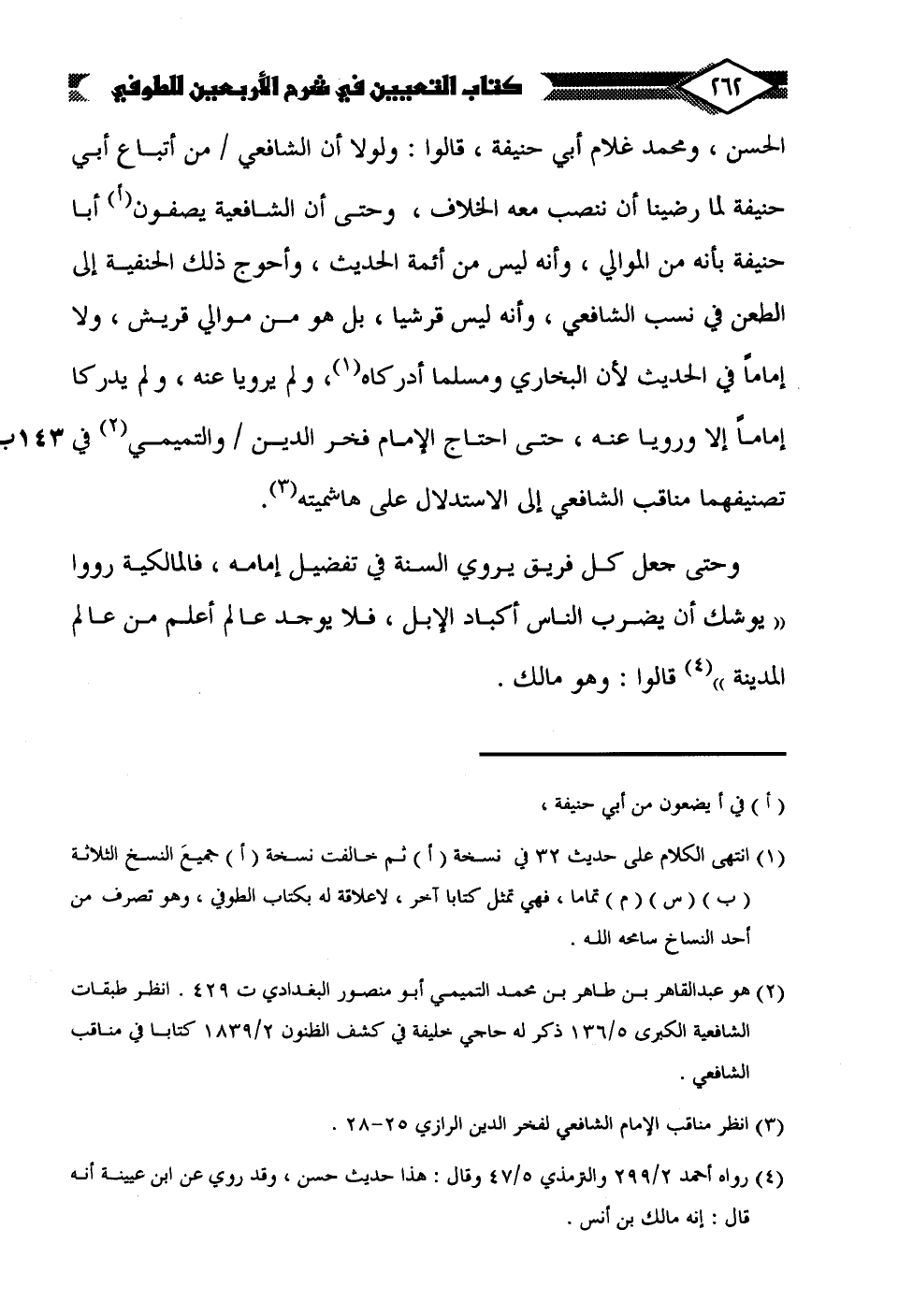 الحسن، ومحمد غلام أبي حنيفة، قالوا: ولولا أن الشافعي من أتباع أبي حنيفة لما رضينا أن ننصب معه الخلاف، وحتى أن الشافعية يصفون (أ) أبا حنيفة بأنه من الموالي، وأنه ليس من أئمة الحديث، وأحوج ذلك الحنفية إلى الطعن في نسب الشافعي، وأنه ليس قرشيا، بل هو من موالي قريش، ولا إمامًا في الحديث لأن البخاري ومسلما أدركاه (¬1)، ولم يرويا عنه، ولم يدركا إمامًا إلا ورويا عنه، حتى احتاج الإمام فخر الدين والتميمي (¬2) في تصنيفهما مناقب الشافعي إلى الاستدلال على هاشميته (¬3).