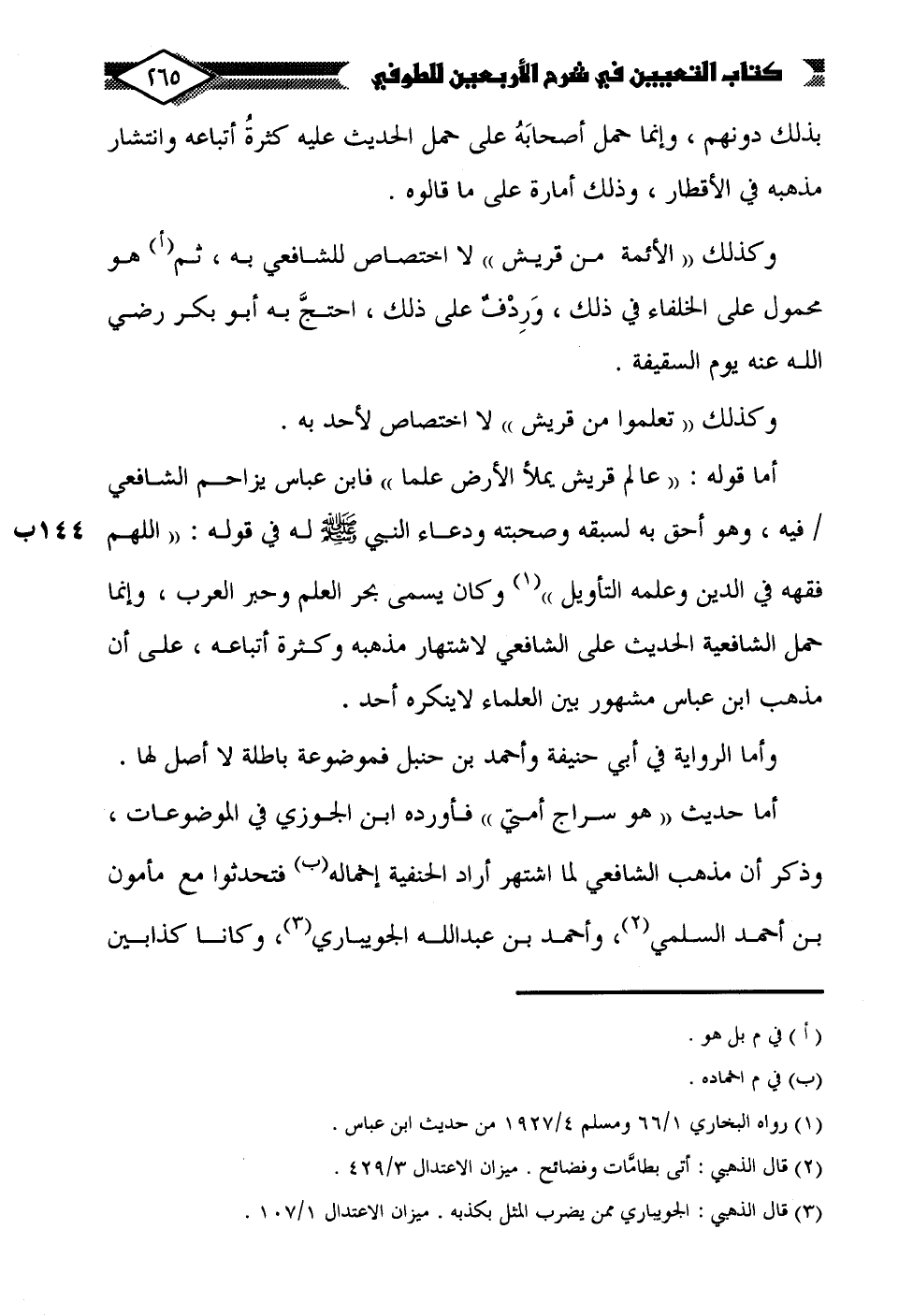 أما قوله: "عالم قريش يملأ الأرض علما" فابن عباس يزاحم الشافعي فيه، وهو أحق به لسبقه وصحبته ودعاء النبي - صلى الله عليه وسلم - له في قوله: "اللهم فقهه في الدين وعلمه التأويل" (¬1) وكان يسمى بحر العلم وحبر العرب، وإنما حمل الشافعية الحديث على الشافعي لاشتهار مذهبه وكثرة أتباعه، على أن مذهب ابن عباس مشهور بين العلماء لا ينكره أحد.